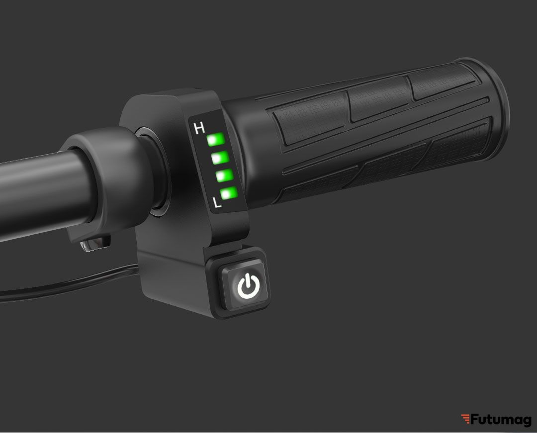 На правой ручке велосипеда расположились индикатор уровня заряда аккумулятора и кнопка питания.