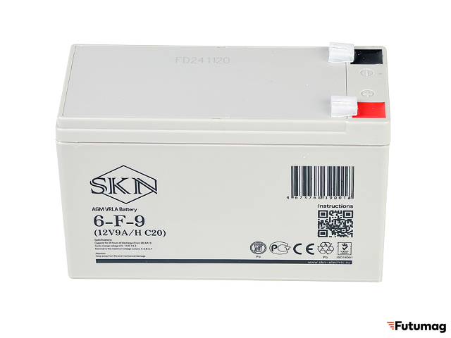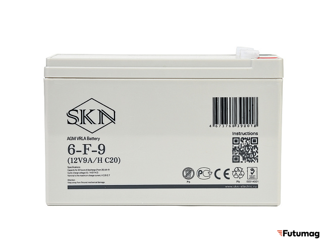 Батарея SKN 6-F-9 имеет ёмкость 9 A/h при 20-часовом разряде (С20). Рабочее напряжение составляет 12 V, а её размеры — 151 мм в длину, 65 мм в ширину и 100 мм в высоту. Вес аккумулятора составляет 2,57 кг, что делает его достаточно легким и удобным для установки в различных устройствах. Полярность — прямая (+ -), что упрощает подключение.