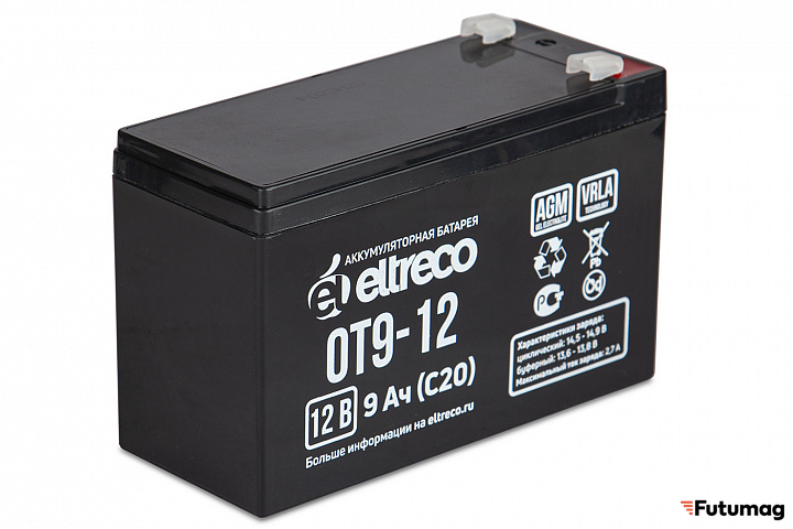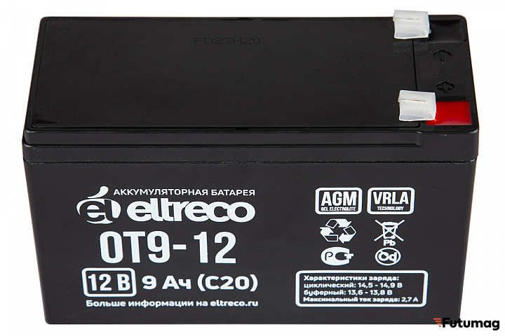 БрендEltrecoЕмкость9000 mAhТипТяговый необслуживаемый AGM VRLAНапряжение12 VВремя зарядки6 чВес2.4 кгТок зарядки2.7 AДлина151 ммШирина65 ммВысота100 мм -