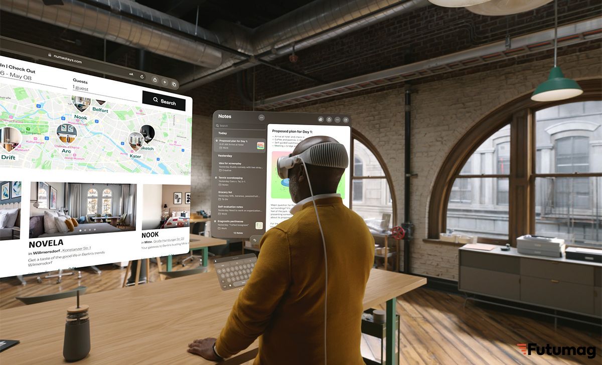 Apple Vision Pro предлагает бесконечное интерактивное пространство для работы с любимыми приложениями. От веб-страниц в Safari до записей в Заметках или диалогов в Сообщениях — располагайте все окна в любых местах вокруг себя и масштабируйте до любого размера, не отвлекаясь от реального мира.