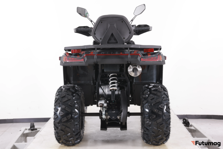Передняя маятниковая (рычажная) подвеска обеспечивает отличную управляемость и комфорт во время движения по неровной местности. С дорожным просветом в 150 мм и высотой по сидению 800 мм, квадроцикл подходит для пользователей ростом от 150 см и выше, обеспечивая удобство и безопасность.