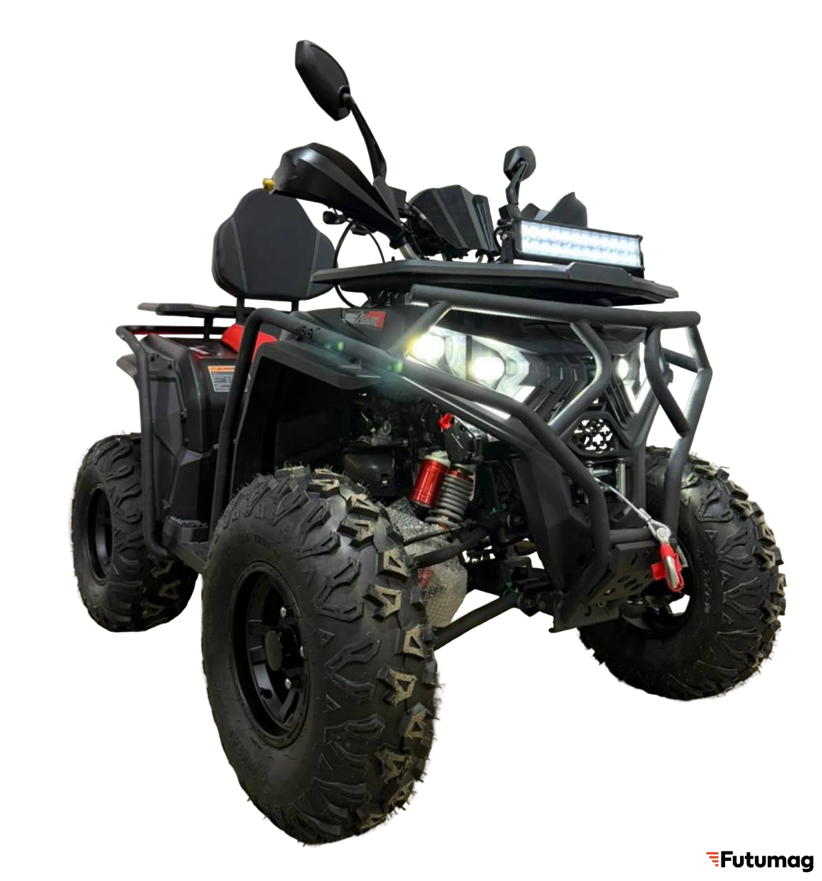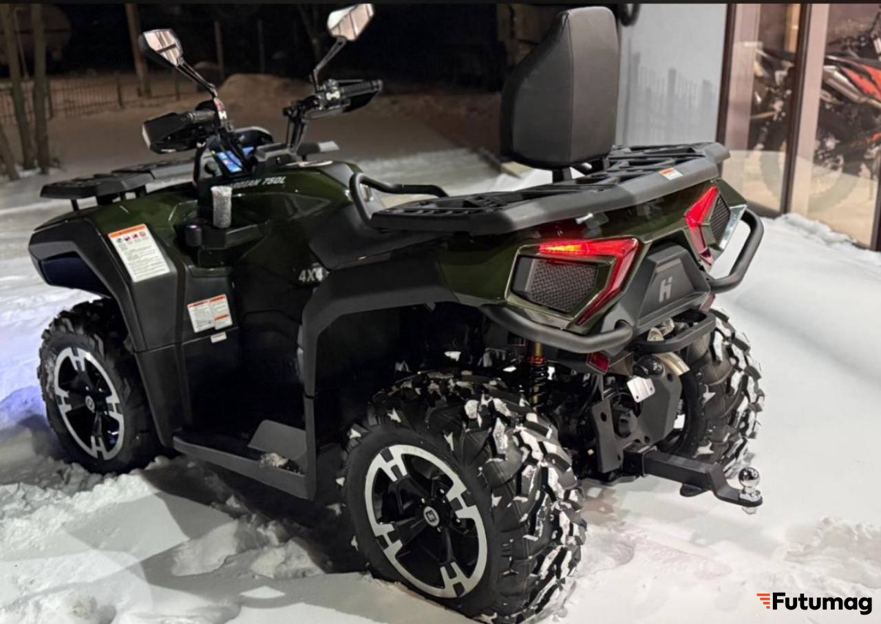 Квадроцикл оснащен высокоэффективной тормозной системой с дисковыми тормозами и гидравлическим приводом, что гарантирует надежное торможение на любых скоростях. Передняя подвеска с двухрычажной системой и задняя маятниковая подвеска с наноамортизатором обеспечивают отличную устойчивость и комфорт во время движения по неровным участкам.