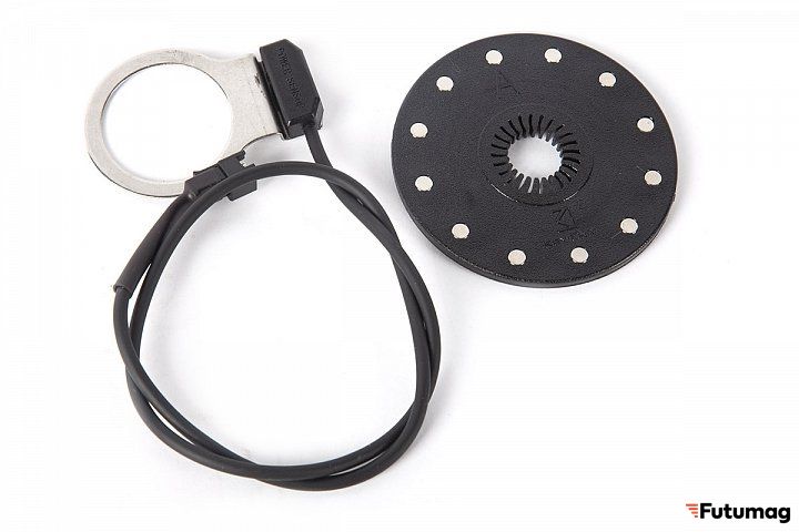 На каретку устанавливается датчик вращения педалей - он необходим для активации режима помощника, который активирует электромотор при вращении педалей. Усилия помощи электромотора при педалировании регулируются путём выставления уровня PAS (ассистента) на управляющем велокомпьютере.