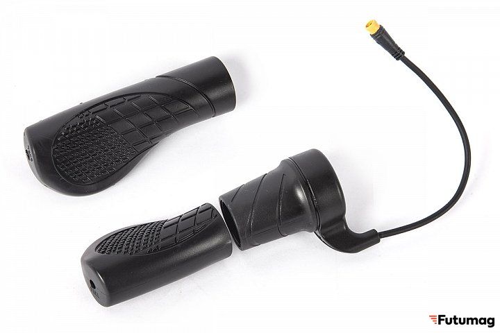 Две ручки тормоза, идущие в комплекте, снабжены концевиками, которые отключают электромотор при торможении.