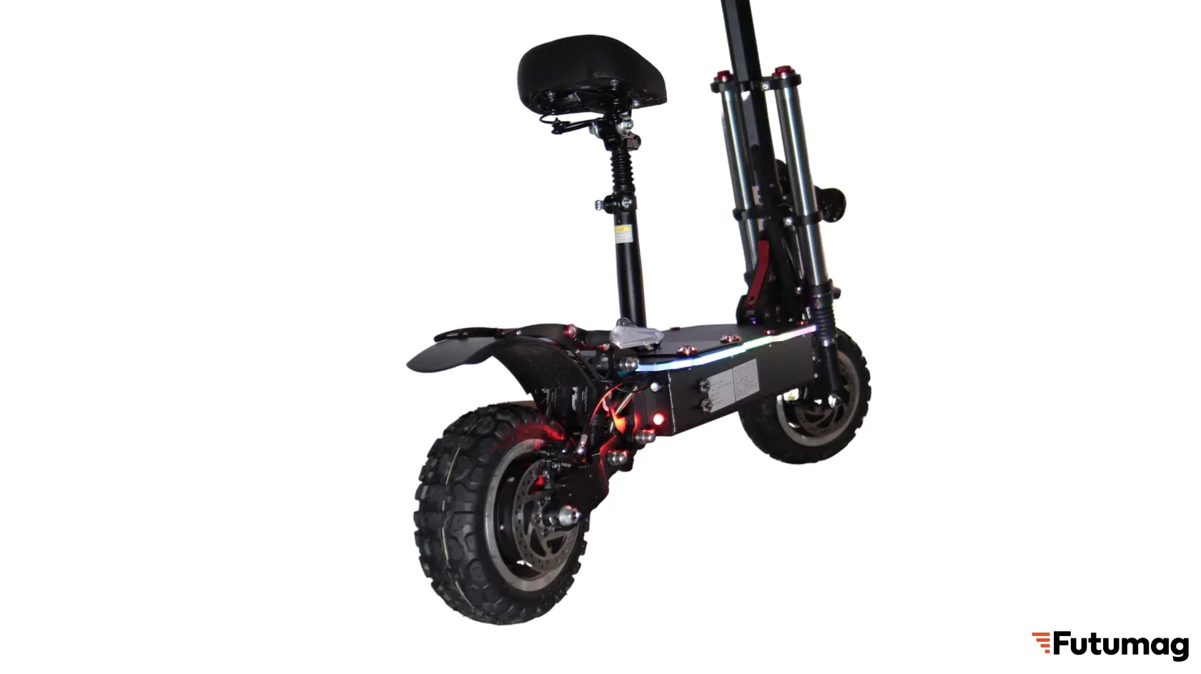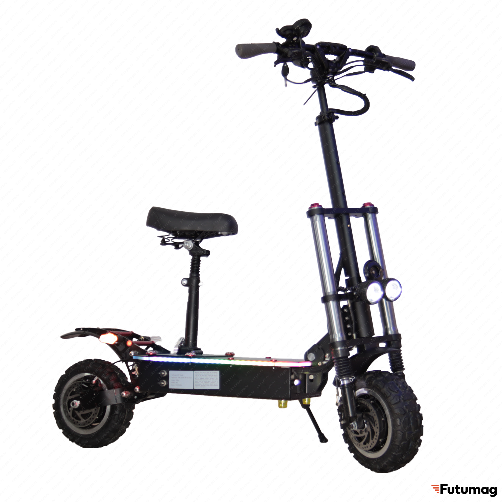 - Для комфорта и безопасности райдера в конструкции самоката предусмотрена широкая дека с наждачным покрытием, яркие фары и съемное сиденье.