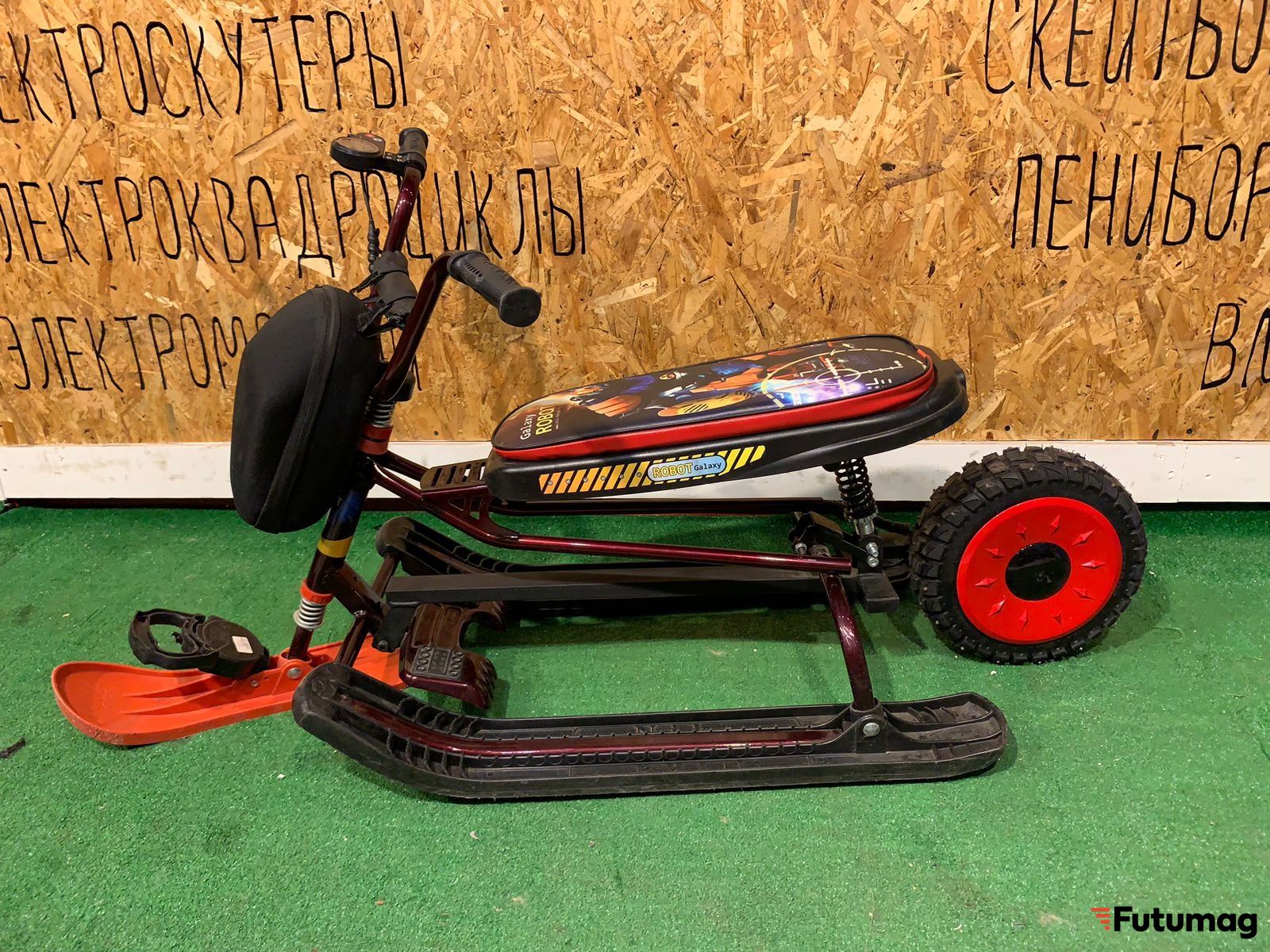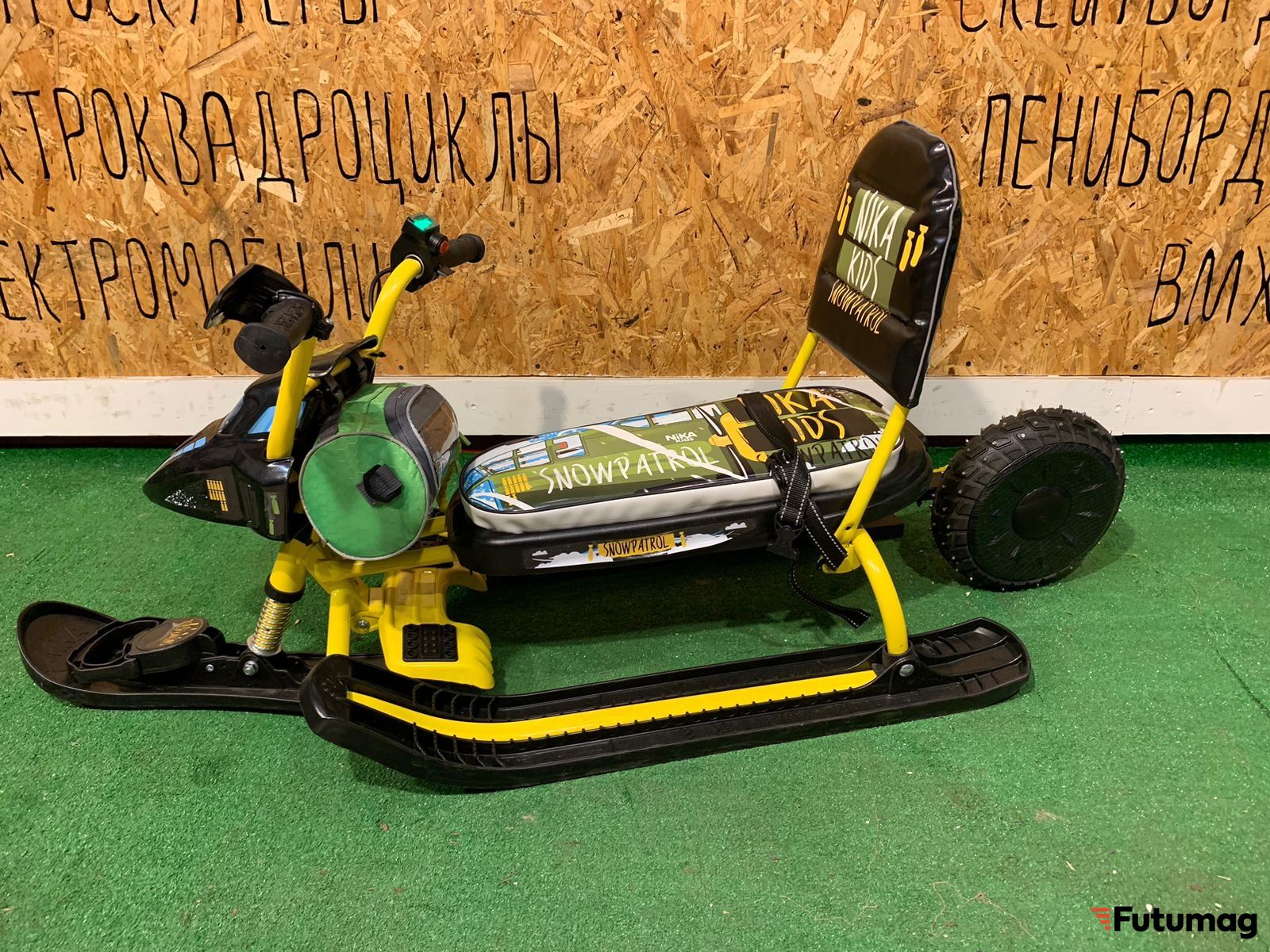 - Мощности хватает как на 2 детей, так и на небольшого взрослого. Снегокат резво набирает скорость;
