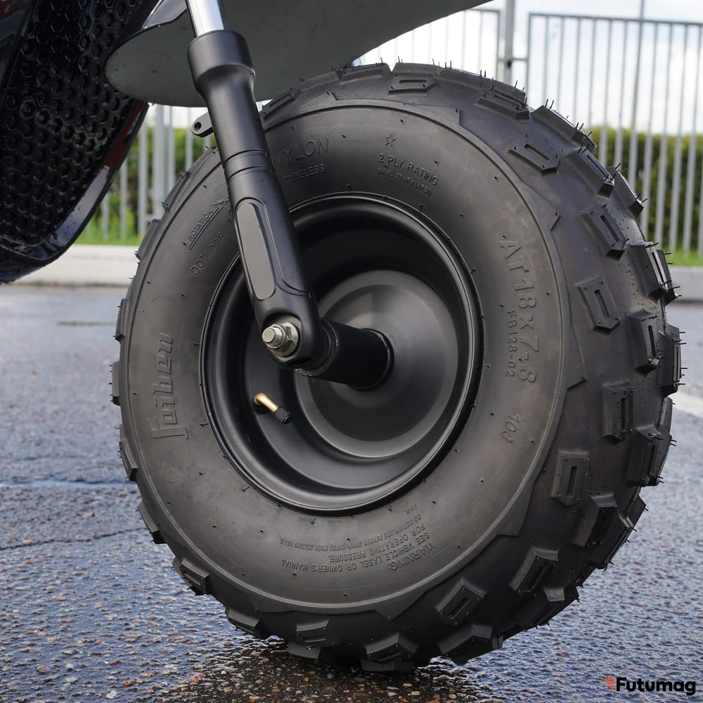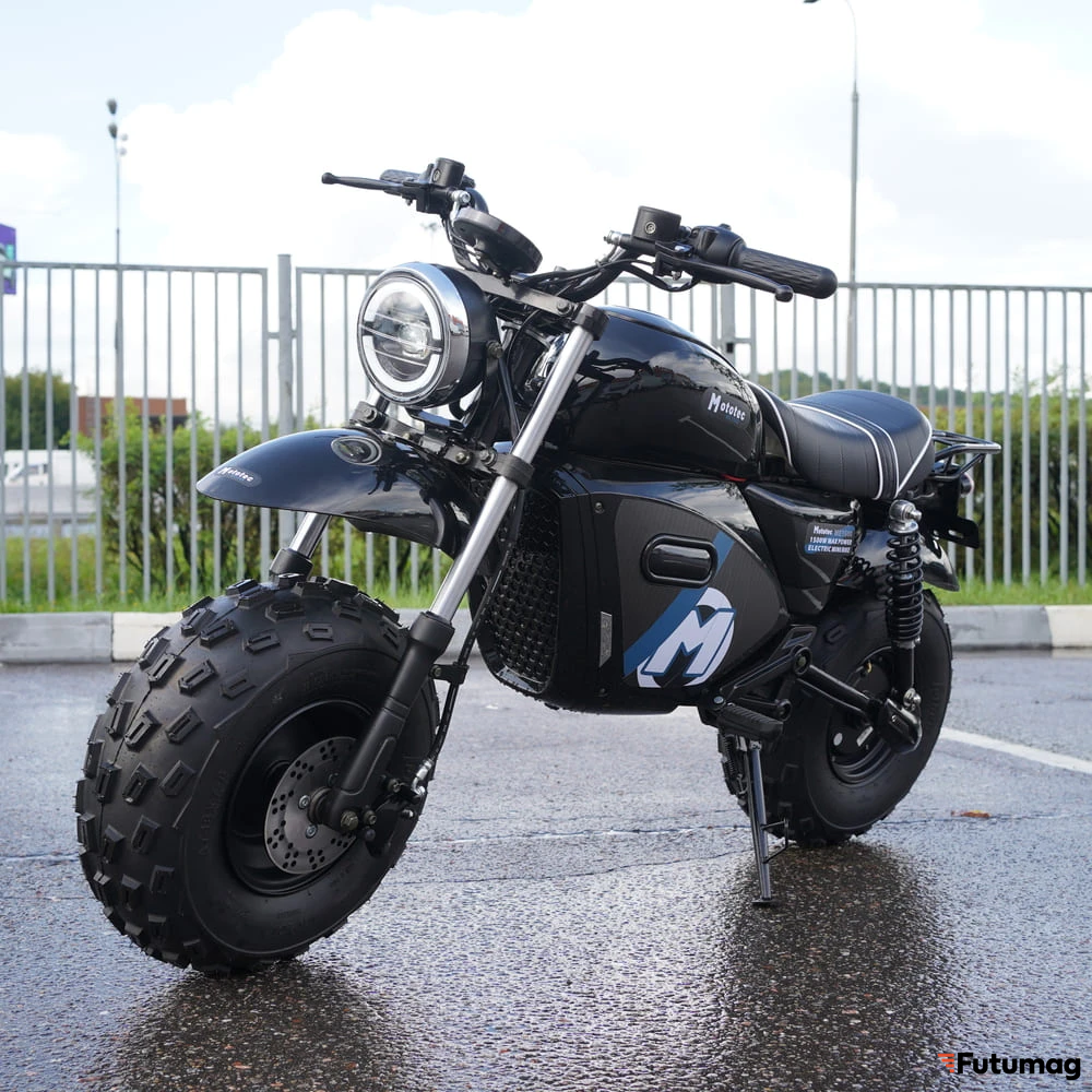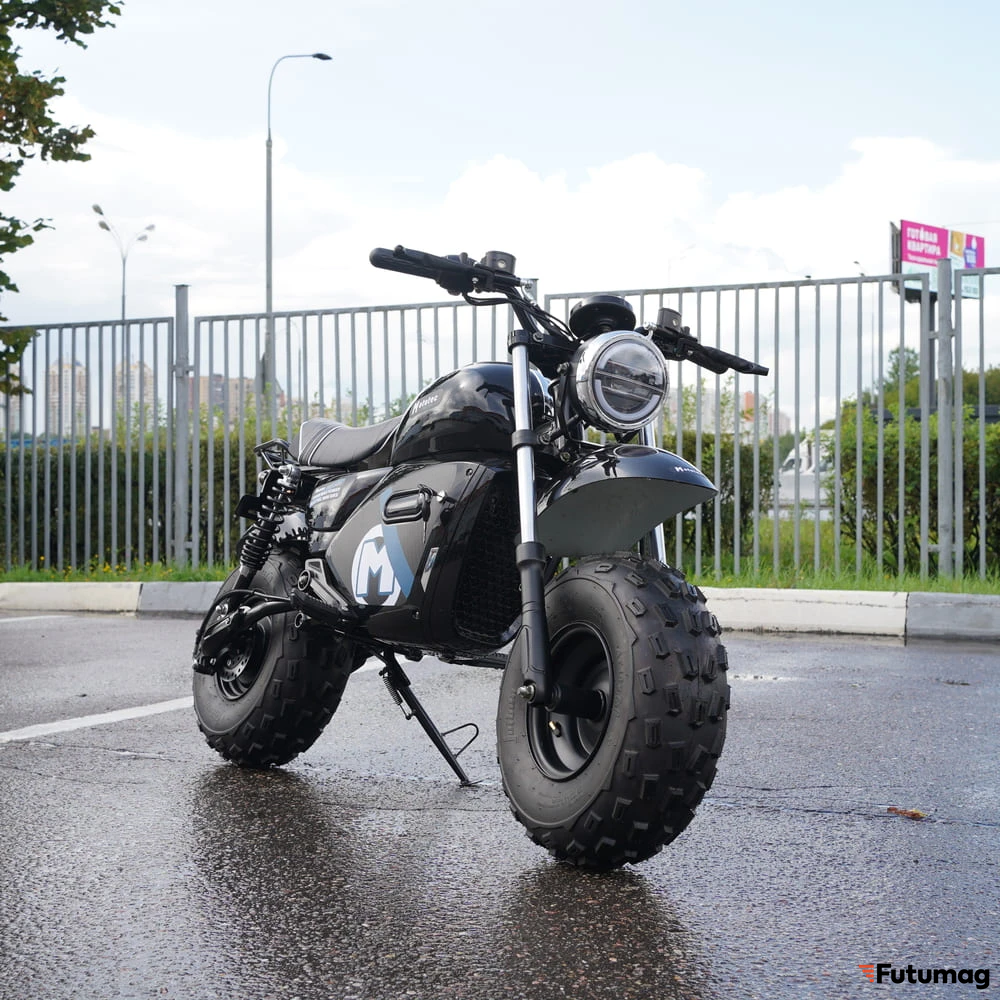 Внешний вид MotoTec — это не фантазия дизайнера, а отражение его инженерной сути. Высокий дорожный просвет, агрессивный протектор шин, длинноходная подвеска с амортизаторами и высокие пластиковые крылья — всё это не для красоты. Это функциональные элементы, позволяющие байку уверенно чувствовать себя на грунтовых дорогах, полевых тропинках, в песчаных карьерах и на других лёгких видах бездорожья. Подвеска эффективно гасит удары от кочек и ям, делая езду комфортной и контролируемой даже на неровностях, где обычный городской скутер давно бы остановился.