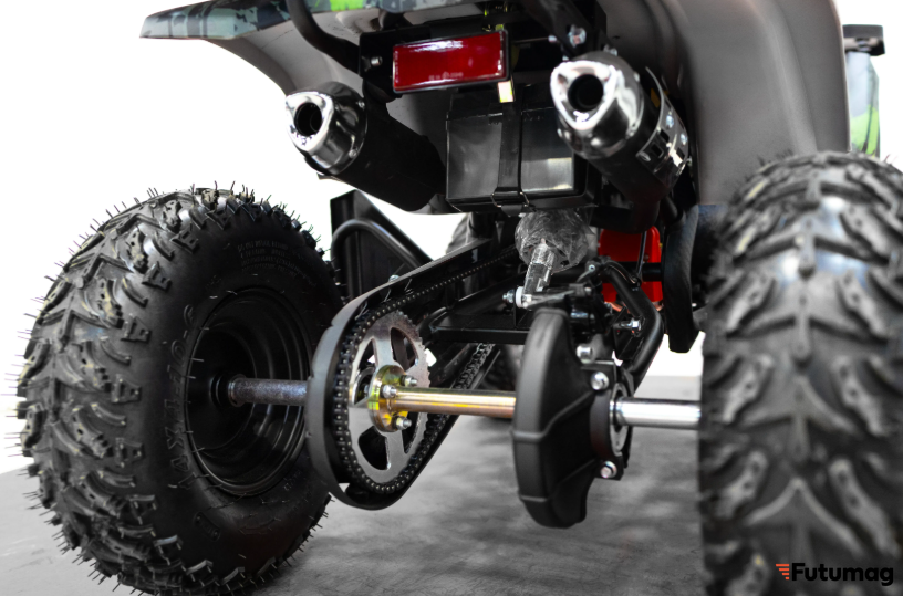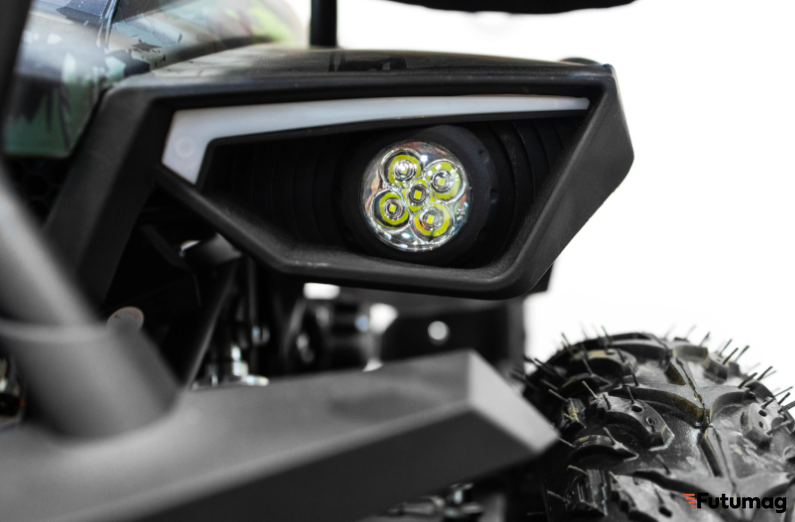 Квадроцикл также оборудован LED-фарами для улучшенной видимости в темное время суток, а звуковой сигнал добавляет элемент безопасности во время движения.