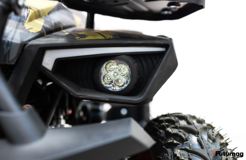 Квадроцикл также оборудован LED-фарами для улучшенной видимости в темное время суток, а звуковой сигнал добавляет элемент безопасности во время движения.
