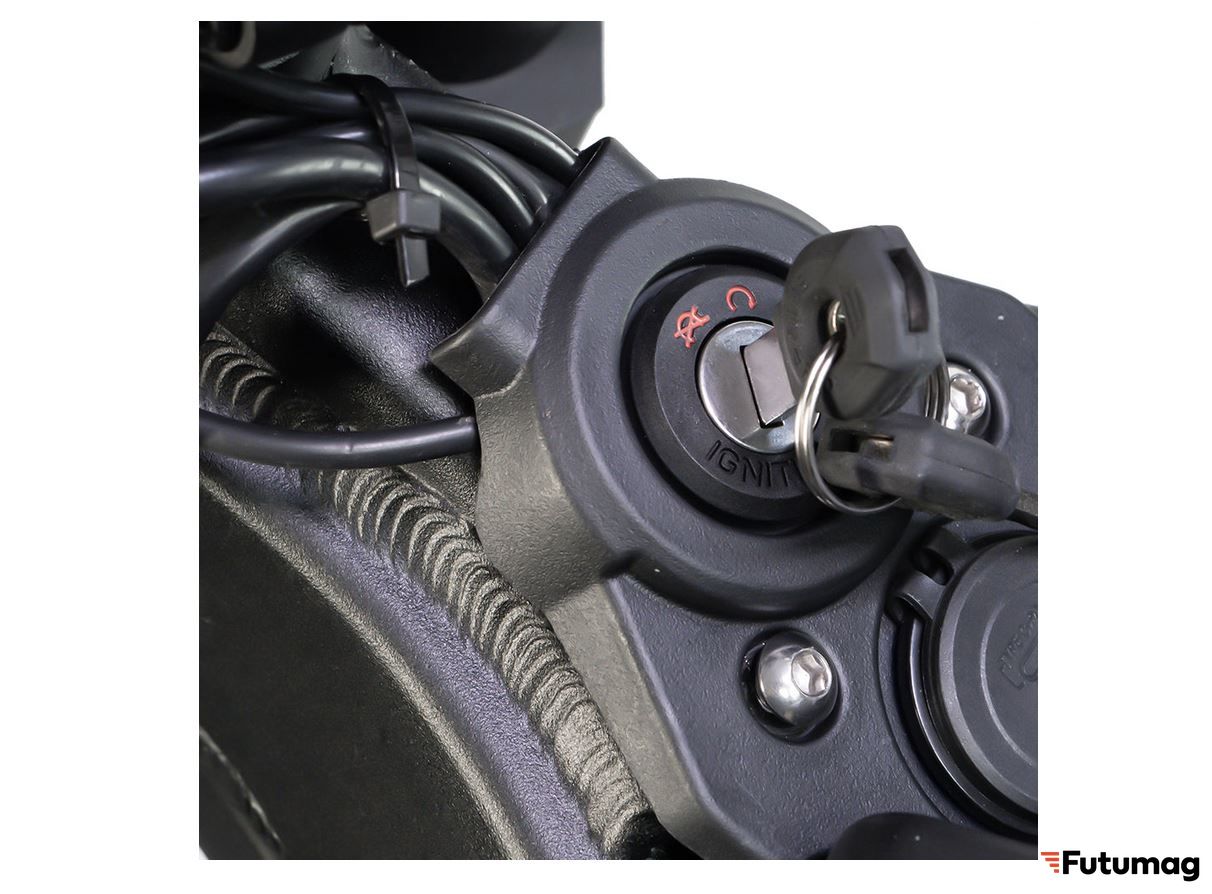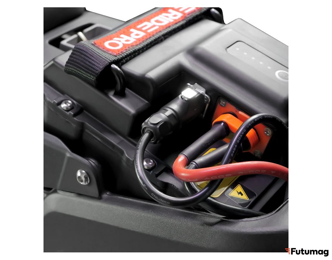 Аккумулятор типа Li-on имеет ёмкость 40 Ач и напряжение 72 В, что позволяет проехать на одном заряде до 100 км. Время полной зарядки составляет до 3-х часов.