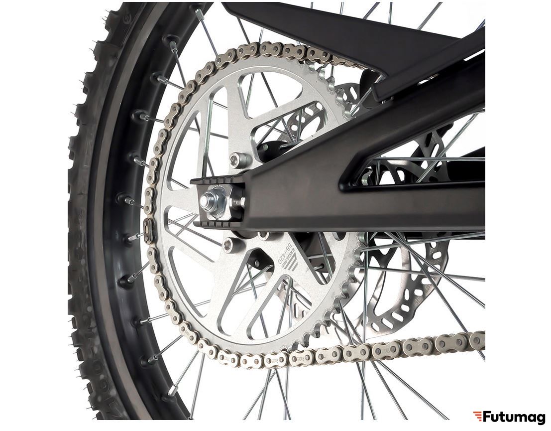 Оснащён бесщёточным двигателем с воздушным охлаждением, который обеспечивает максимальную мощность 5 кВт и пиковую мощность 12 кВт. Благодаря этому, электробайк способен развивать скорость до 97 км/ч.