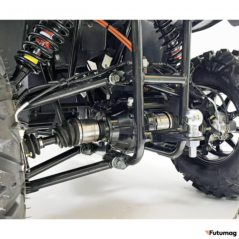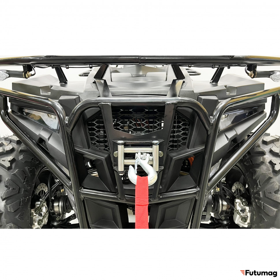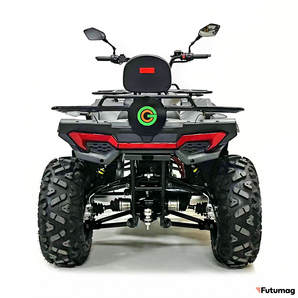 Квадроцикл оборудован дифференциальной передачей и регулируемыми амортизаторами, что обеспечивает отличное сцепление с дорогой и комфортную езду по неровным поверхностям. Дисковые гидравлические тормоза как спереди, так и сзади гарантируют надежное торможение, что повышает безопасность во время поездок.