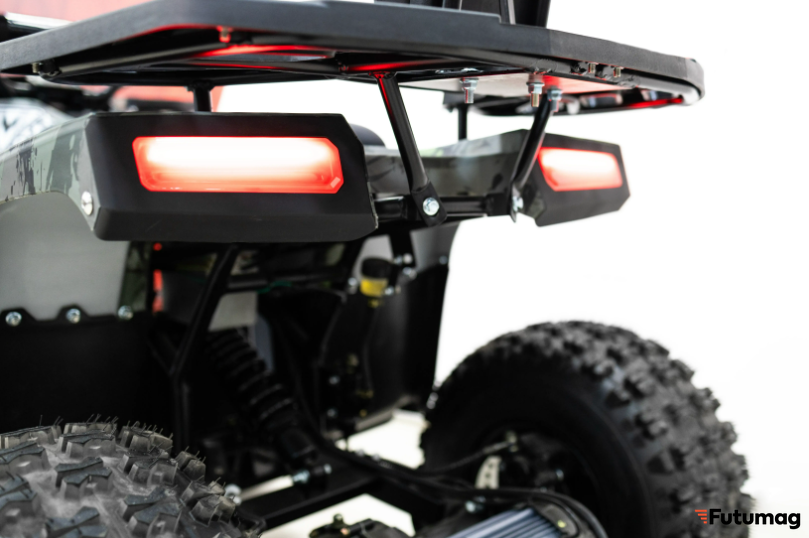- Квадроцикл оснащен шоссейными шинами и 8-дюймовыми колесами, что обеспечивает отличное сцепление с дорогой и плавное движение на любой местности.
