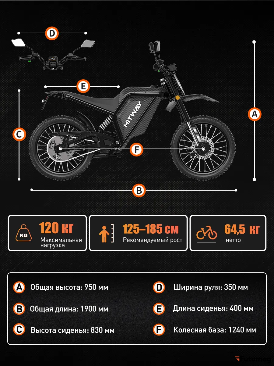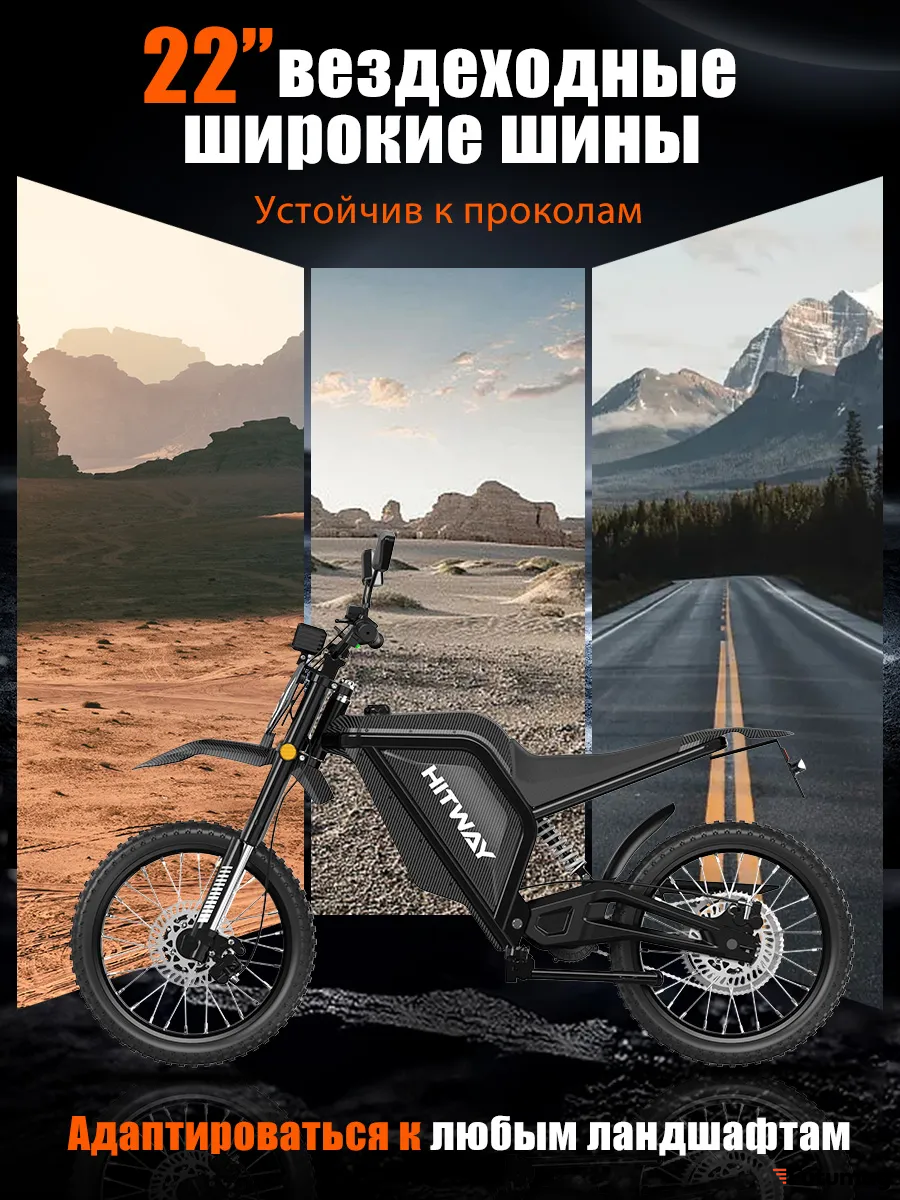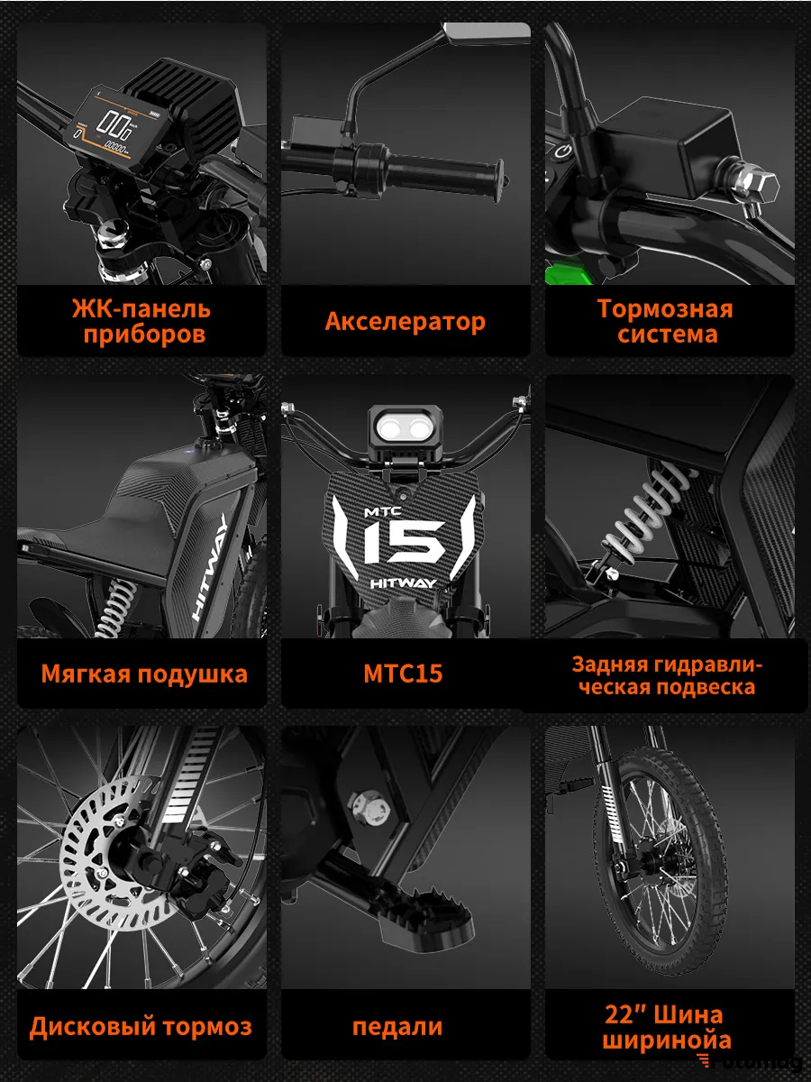 Электропитбайк HITWAY MTC15 представляет собой мощное электрическое транспортное средство, сочетающее внедорожные возможности с комфортом городской езды. Колеса диаметром 22 дюйма обеспечивают отличную проходимость и уверенное преодоление неровностей. Максимальная нагрузка составляет 120 кг, что позволяет использовать питбайк водителям с различной комплекцией.