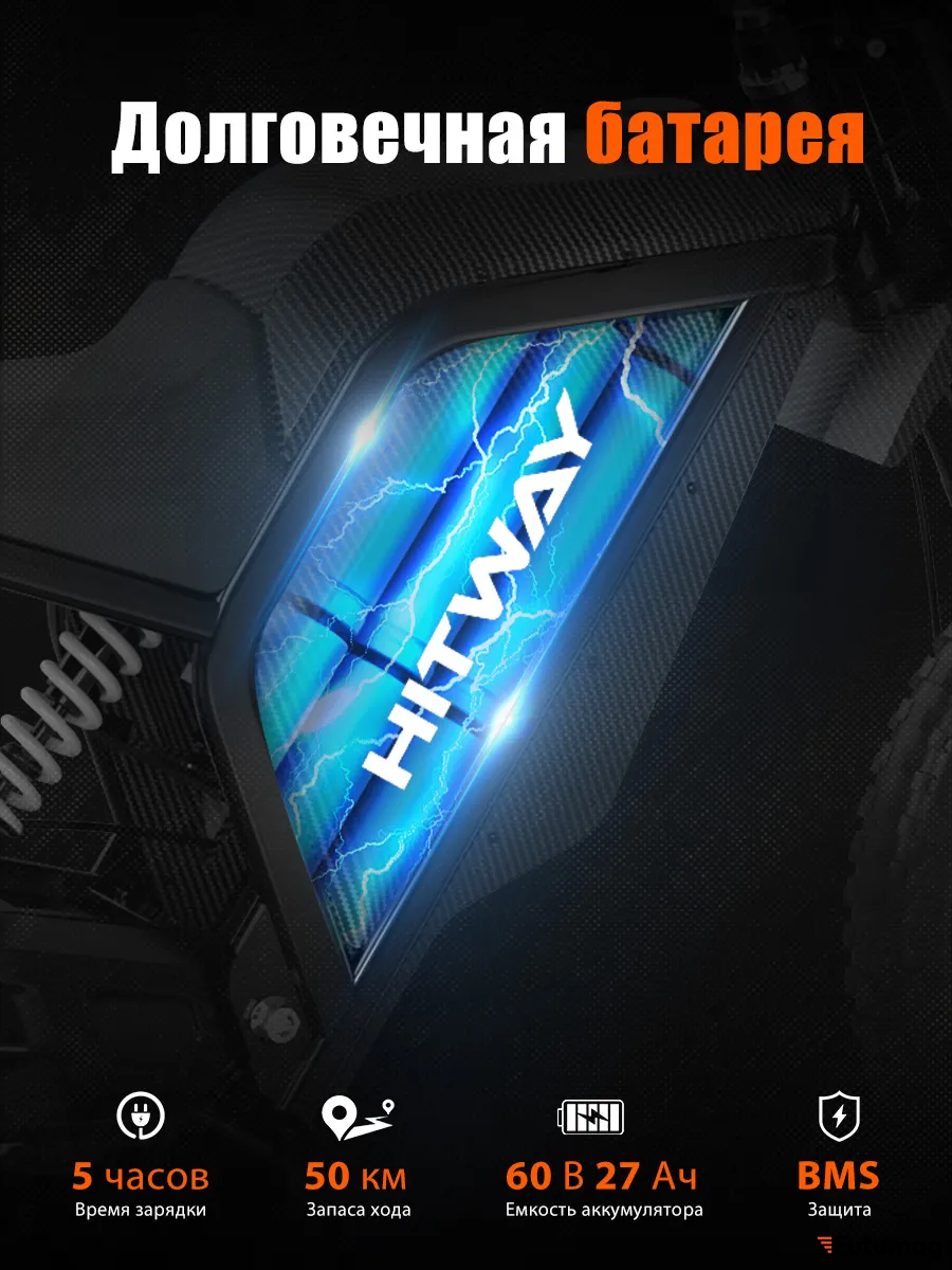 БрендHITWAYМощность двигателя2500 WМаксимальная нагрузка120 кгДиаметр колес22"Емкость АКБ27000 мАчНапряжение60 VПробег на одном заряде50 кмМаксимальная скорость60 км/чВремя полной зарядки5 часовМощная фараестьСиденьеестьПодножкаестьВес64.5 кгДисплейестьУгол подъема30 градусов -
