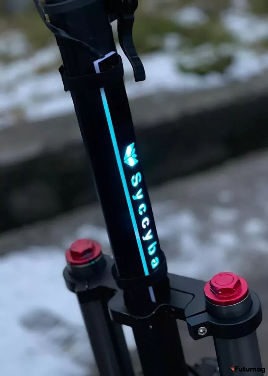 Снизу деки имеется красивая светодиодная подсветка. Для езды в тёмное время суток электросамокат оборудован яркой фарой спереди, а сзади стоп-сигналом. На руле расположены основные элементы управления. Информационный дисплей отображает скорость, пройденное расстояние и оставшийся заряд АКБ.