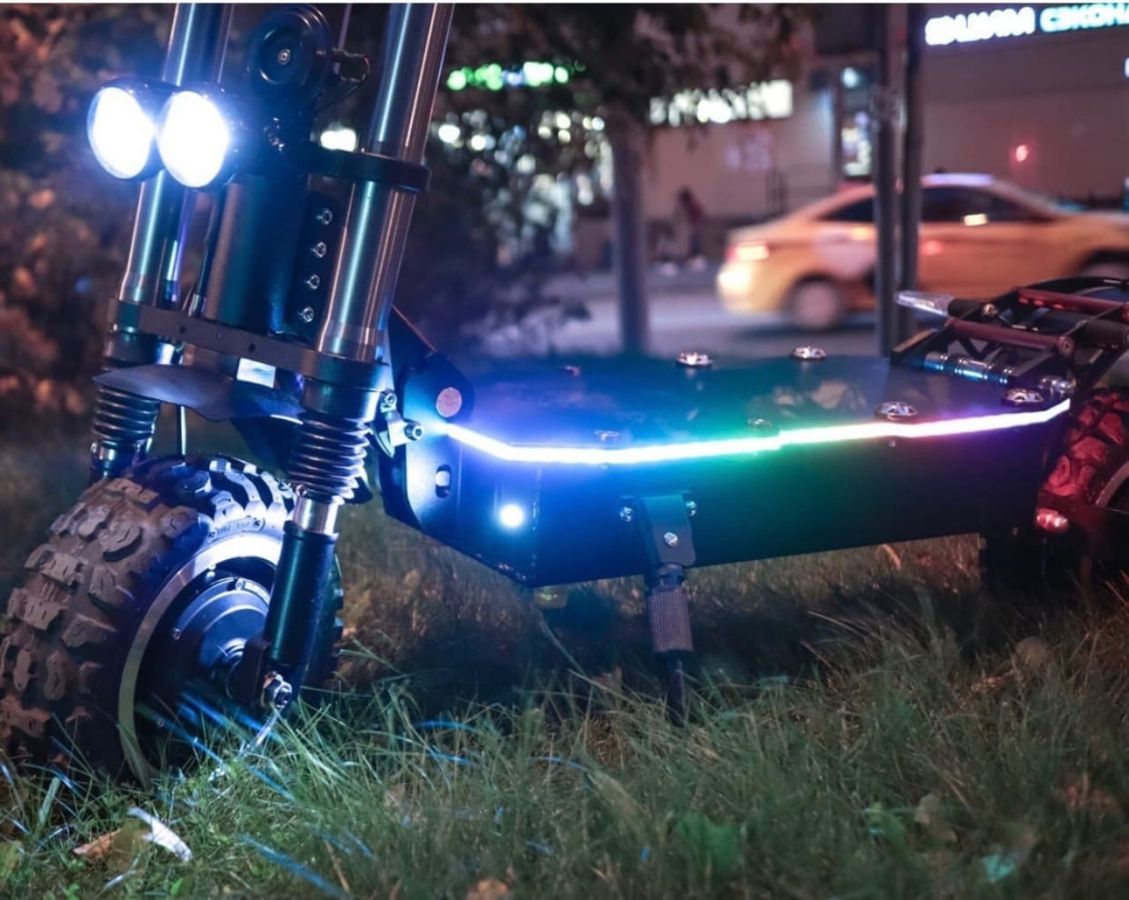 - В каждом его колесе установлен двигатель 3000Вт, благодаря чему на полном приводе электросамокат способен разогнаться до 85 км/ч. Райдер может в любой момент одним нажатием кнопки отключить переднее мотор-колесо для экономии энергии. Даже при езде на заднем приводе этот самокат набирает скорость до 65-70км/ч.