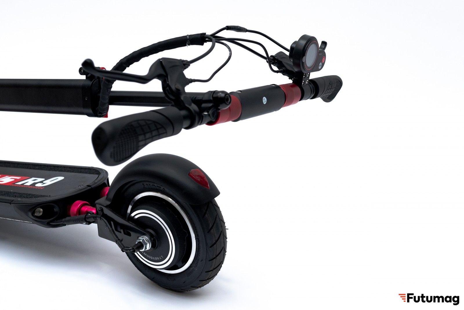 На самокате Currus R9 установлено 9-дюймовое 600 Вт мотор-колесо. С пиковой мощностью до 900 Вт. Это обеспечивает уверенное ускорение и экономию батареи при езде по прямой.