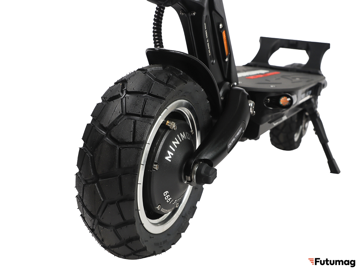 Электросамокат оснащен бескамерными шинами диаметром 10x3.0 дюймов, которые обеспечивают отличное сцепление и комфорт при движении. Тормоза NUTT на переднем и заднем колесах, а также система рекуперации гарантируют надежную остановку и безопасность во время поездок.