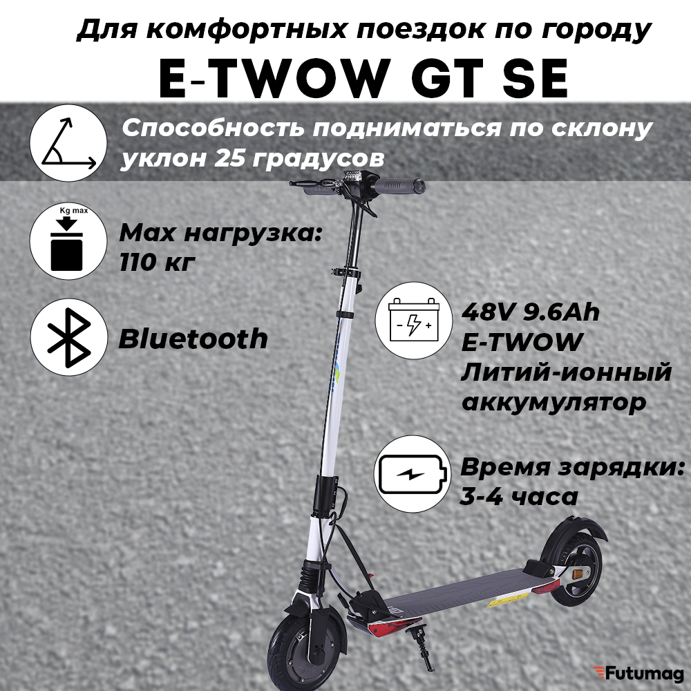 Выбирая E-TWOW GT SE, вы получаете качественный и функциональный электросамокат, который сделает ваши поездки по городу более комфортными и увлекательными.