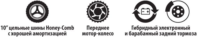 Гибридный электронный и барабанный тормоза гарантируют уверенное передвижение в плотном потоке и своевременную реакцию на любые препятствия даже при максимальной скорости.