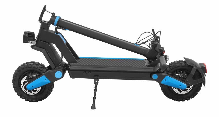 - Система складывания реализована при помощи специального рычага у начала рулевой стойки. Для того, чтобы придать самокату компактный вид, потребуется всего пара секунд – достаточно отодвинуть рычаг и сложить рулевую колонку, закрепив её за задний упор для ног. В сложенном виде самокат не займёт много места, его можно без проблем положить в багажник автомобиля.