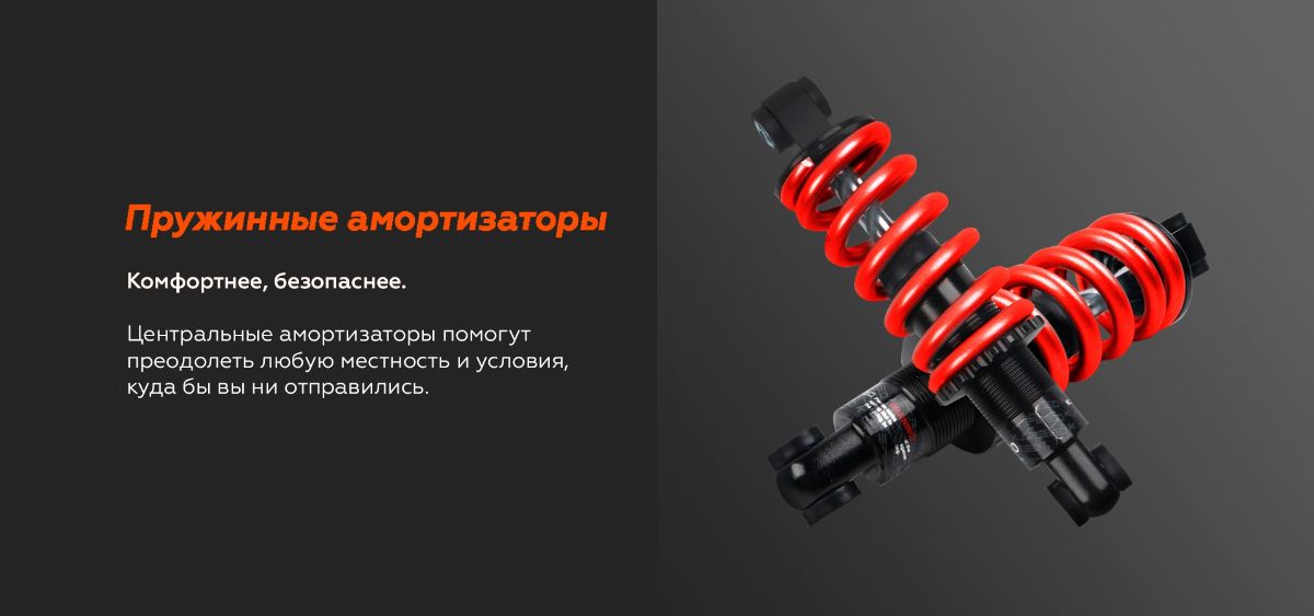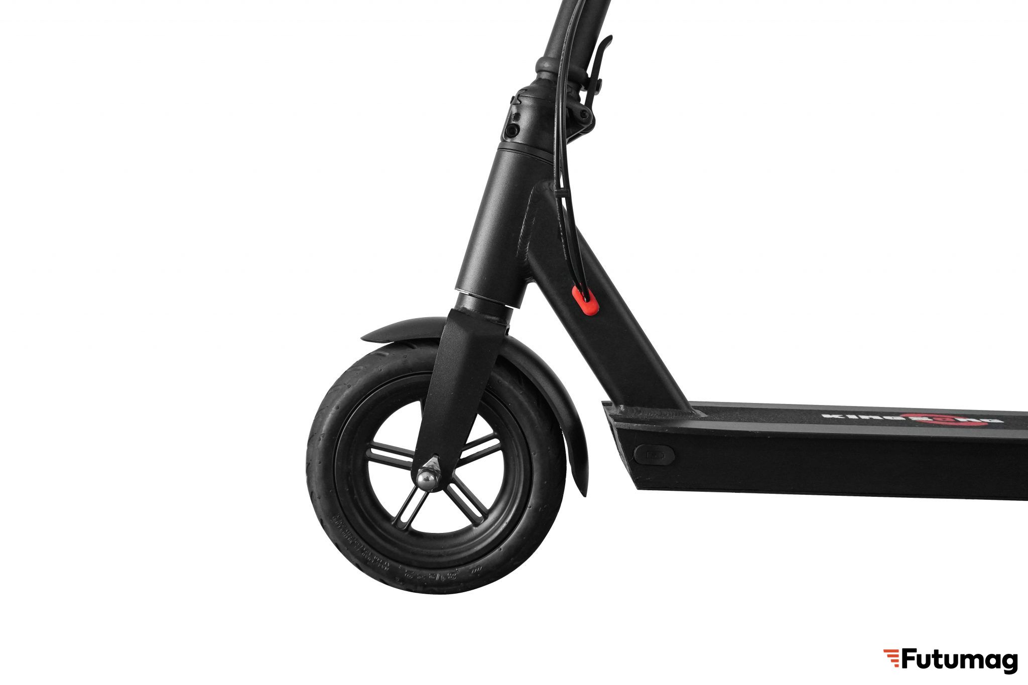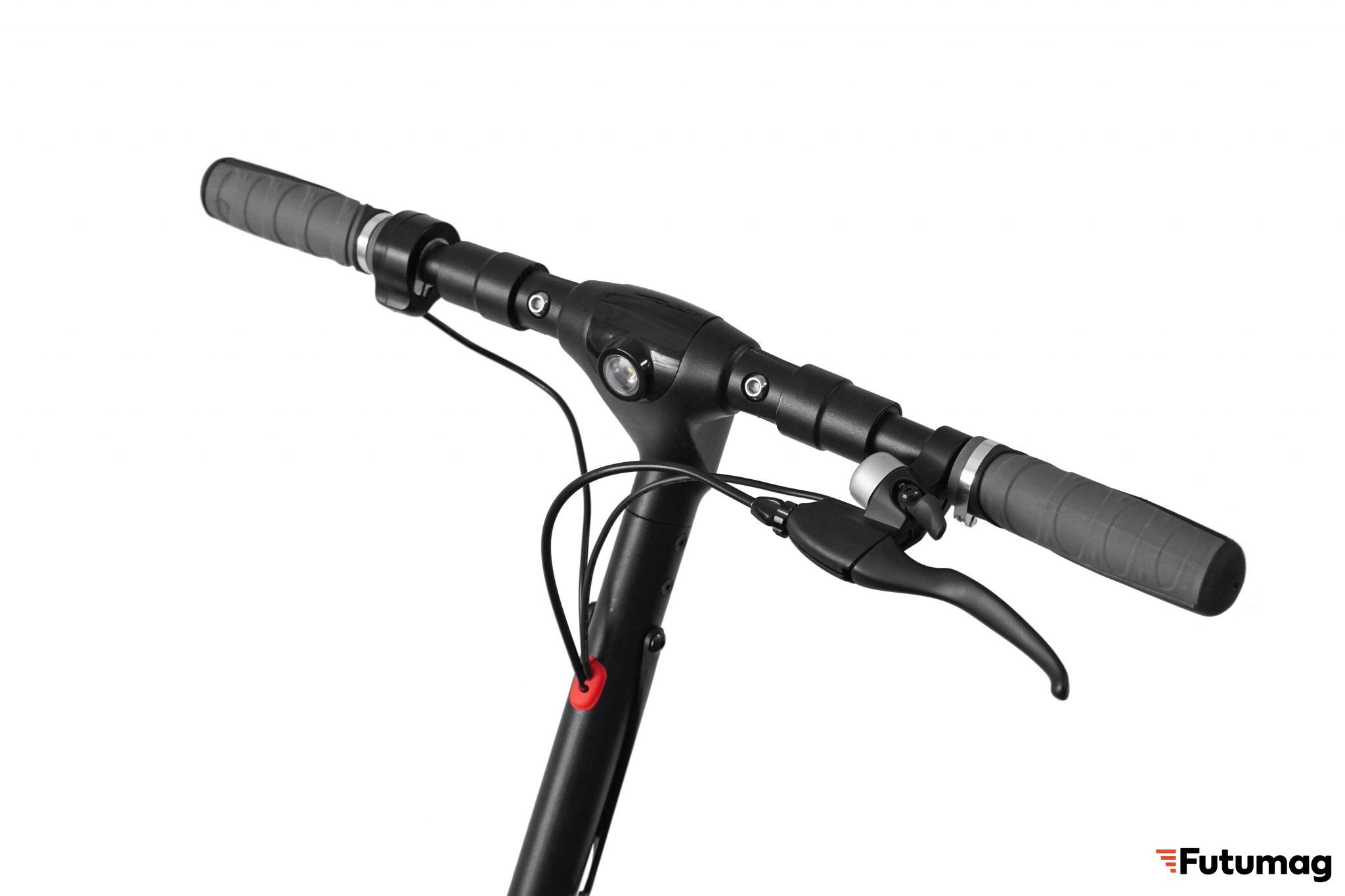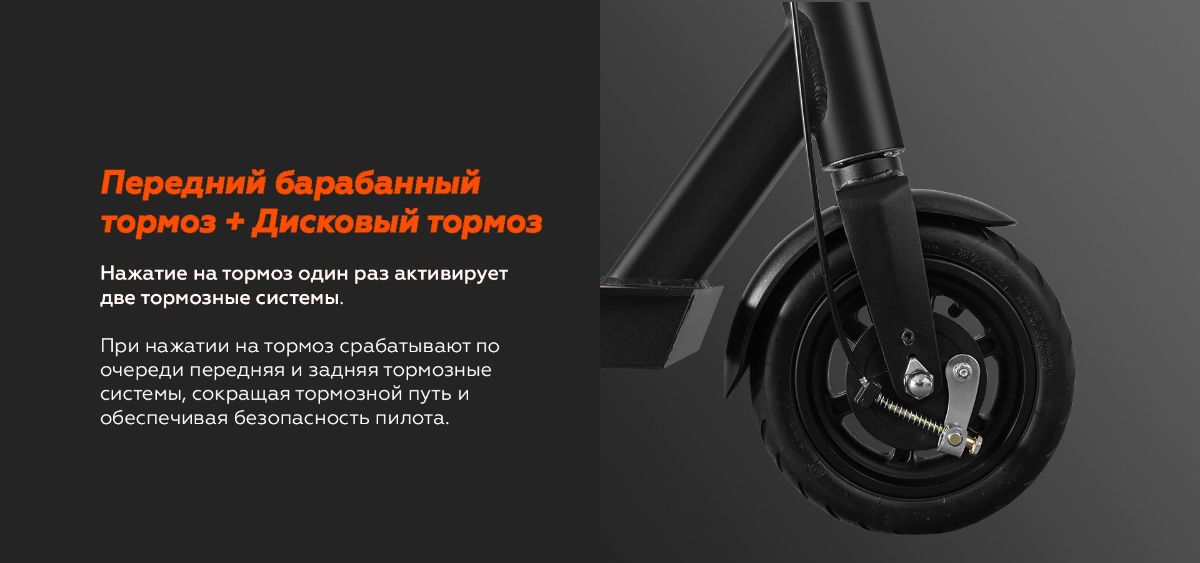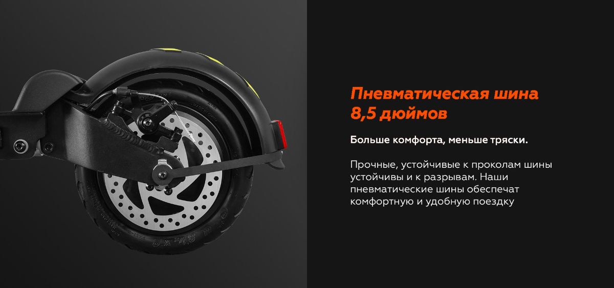 Передняя фара самоката яркая и имеет настройку угла свечения. Сзади на крыле установлен габарит, который загорается красным при включении подсветки. При торможении габарит становится ярче.