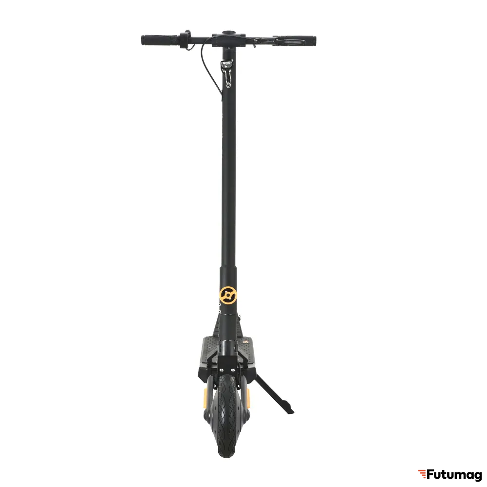 Дека самоката покрыта прорезиненной поверхностью, что обеспечивает безопасность при поворотах и маневрах. Цельнолитые колеса диаметром 9.5 дюймов вместе с системой амортизации обеспечивают плавный ход даже по неровным поверхностям.