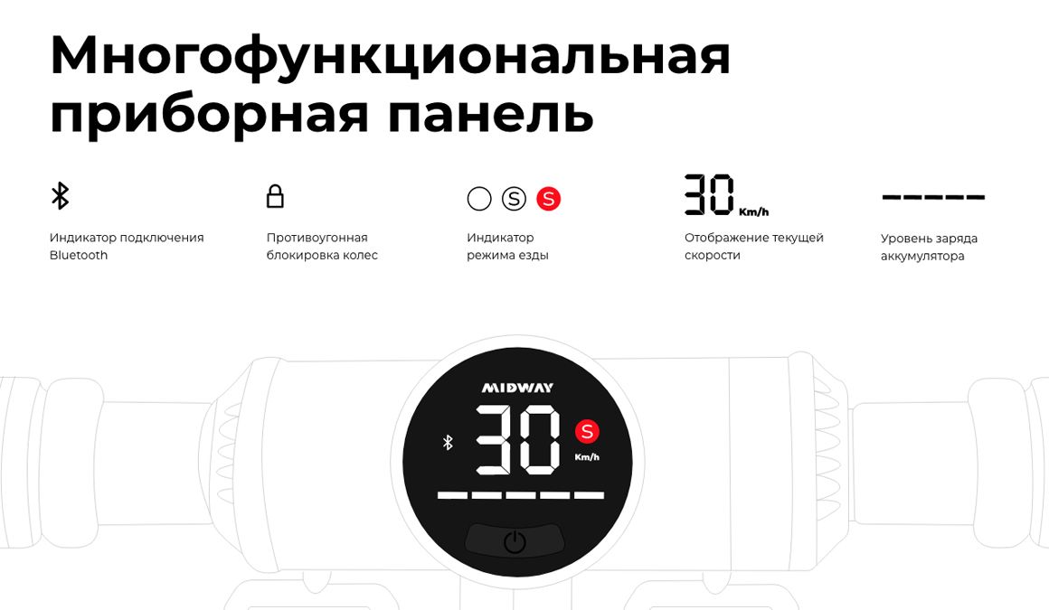 ЦветчерныйВес самоката от 5 до 15 кгестьВес самоката11 кгБрендMIDWAYМощность двигателя350 WАккумулятор5200 mAhНапряжение36 VРазмер колес8"Время полной зарядки3-4 часаПробег на одном зарядедо 20 кмМаксимальная скорость30 км/чМаксимальная нагрузка120 кгАмортизацияесть, спередиСтепень защитыIP56BluetoothестьПриложение для смартфонаестьМатериал рамыавиационный алюминийДавление в колёсах38 psi (2.5 атм)Преодолеваемый угол наклона15 градусовДорожный просвет (клиренс)8.5 смСкладнойестьВес в упаковке, кг13 -
