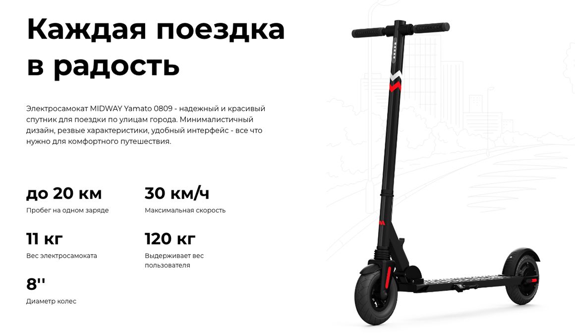 Купить Электросамокат MIDWAY YAMATO 0809 в магазине Futumag24.ru можно, оформив на сайте, и в день а наш курьер привезет Вам выбранную модель!