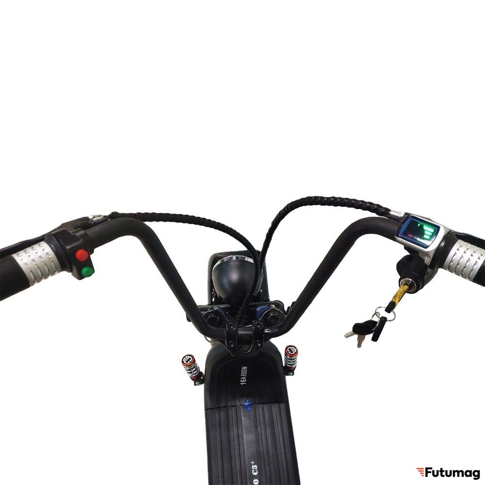 Элементы управления скутером Минипро Ц3+ расположены на руле – там находятся ручки дисковых тормозов, курок газа, кнопки управления подсветкой и звуковым сигналом. Также на правой части руля есть небольшой дисплей, который показывает скорость, уровень заряда аккумулятора и пробег.