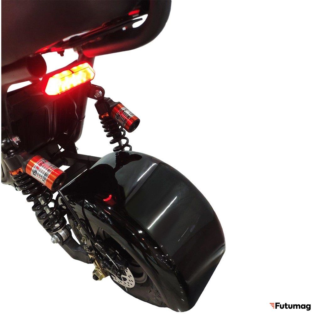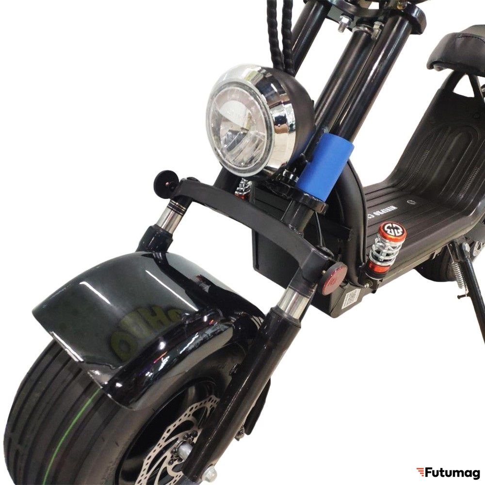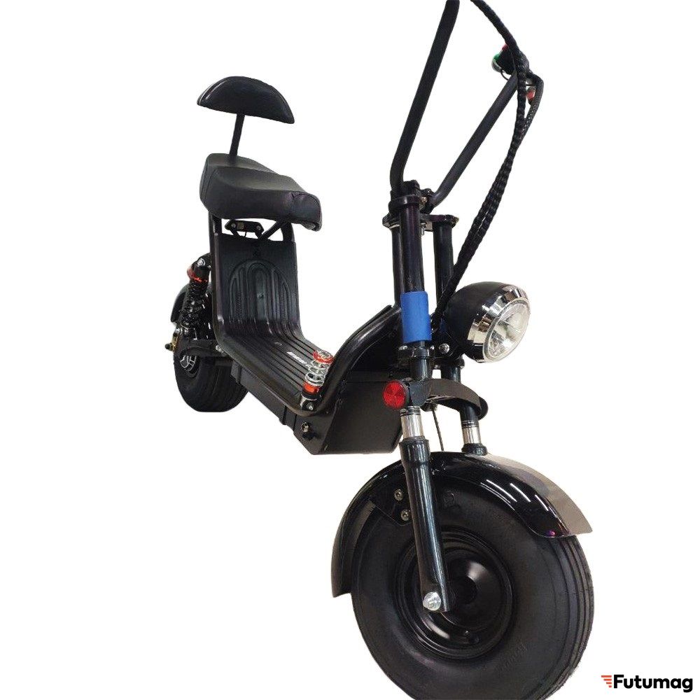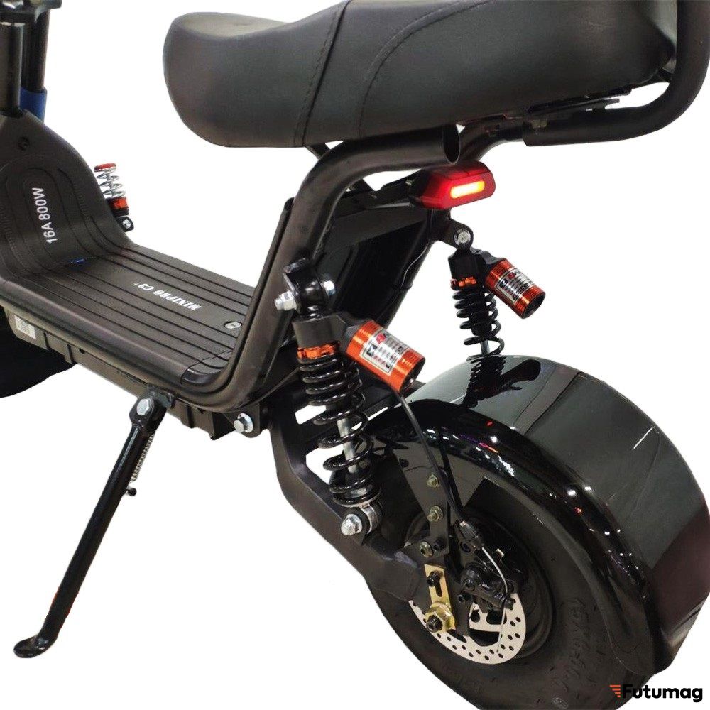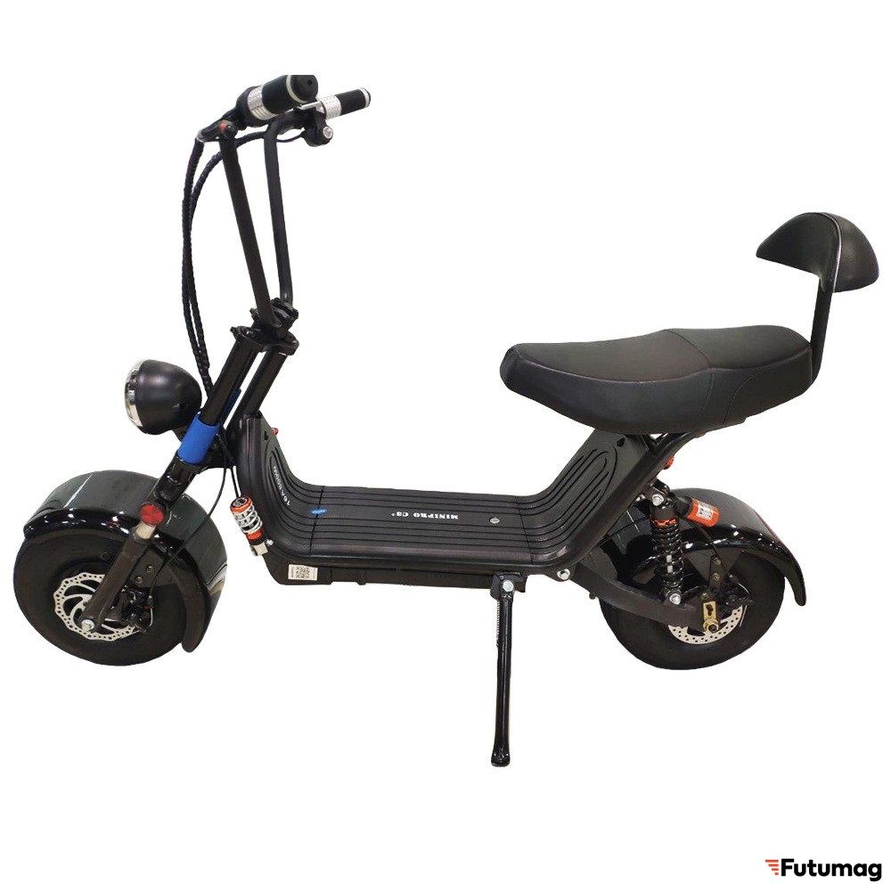 Качественный электроскутер для двоих от MiniPro. Самый главный плюс – высокий клиренс и полноценная подвеска. В совокупности с объемным аккумулятором, одна из лучших моделей на данный момент в этом классе.