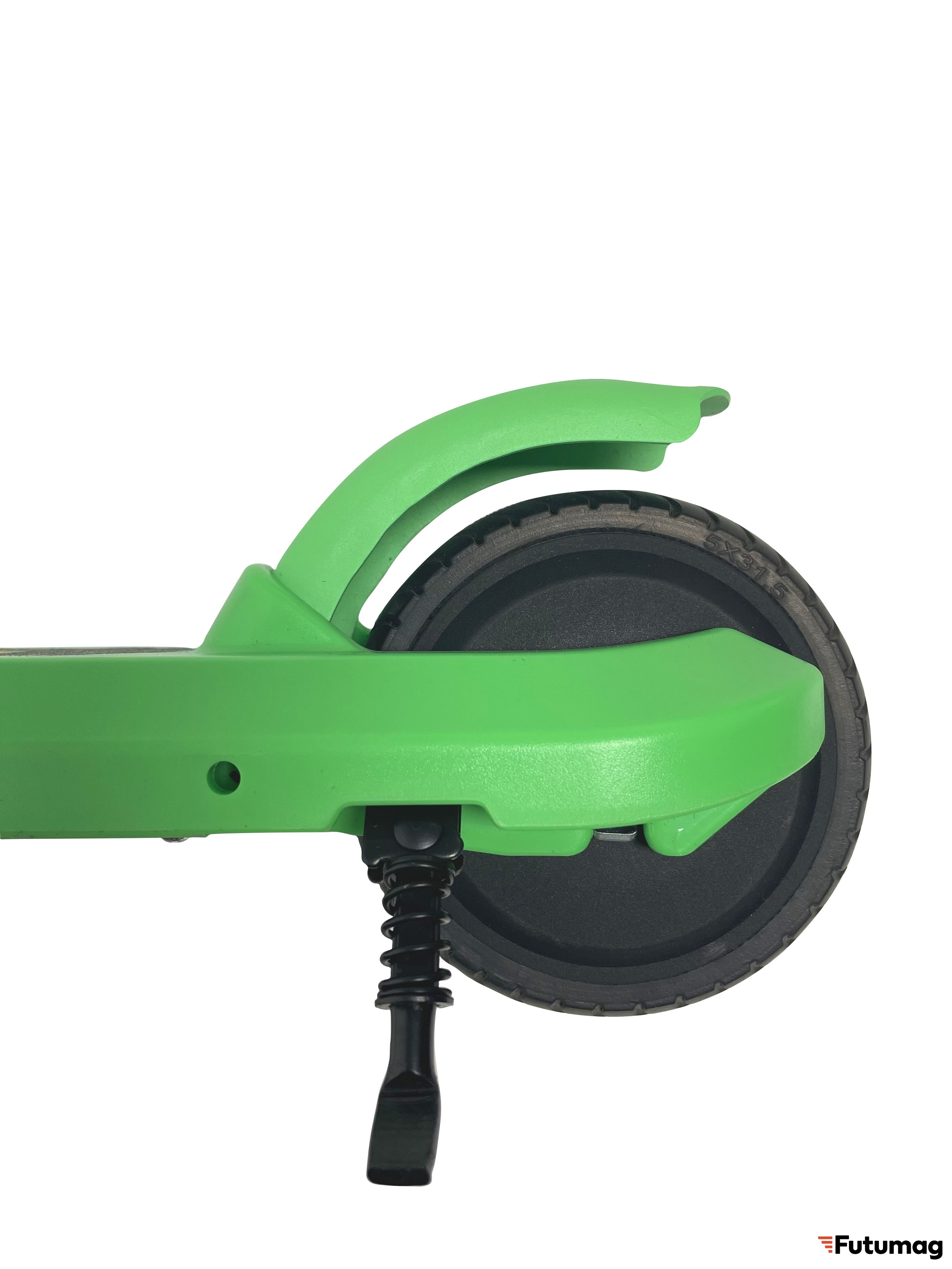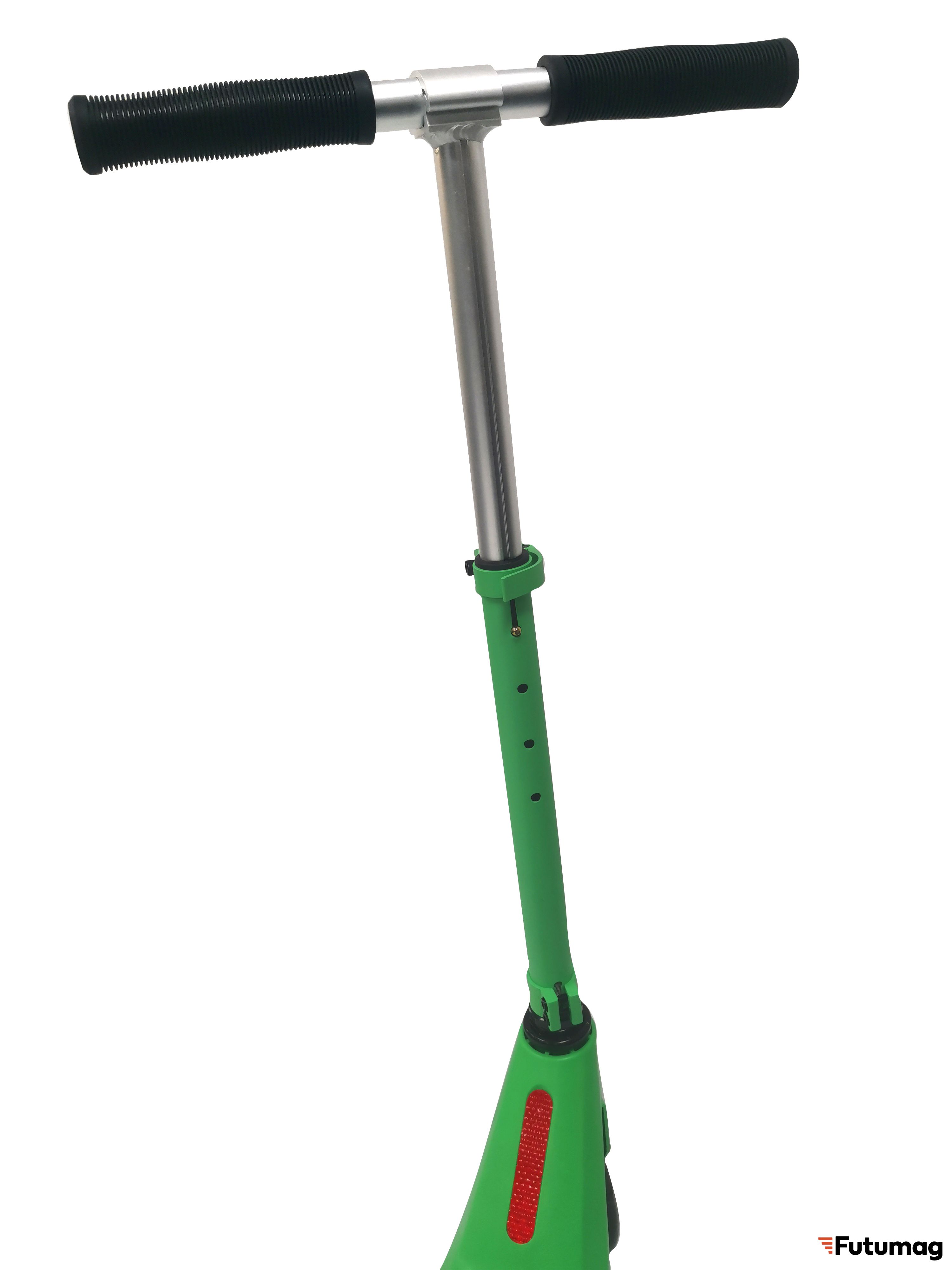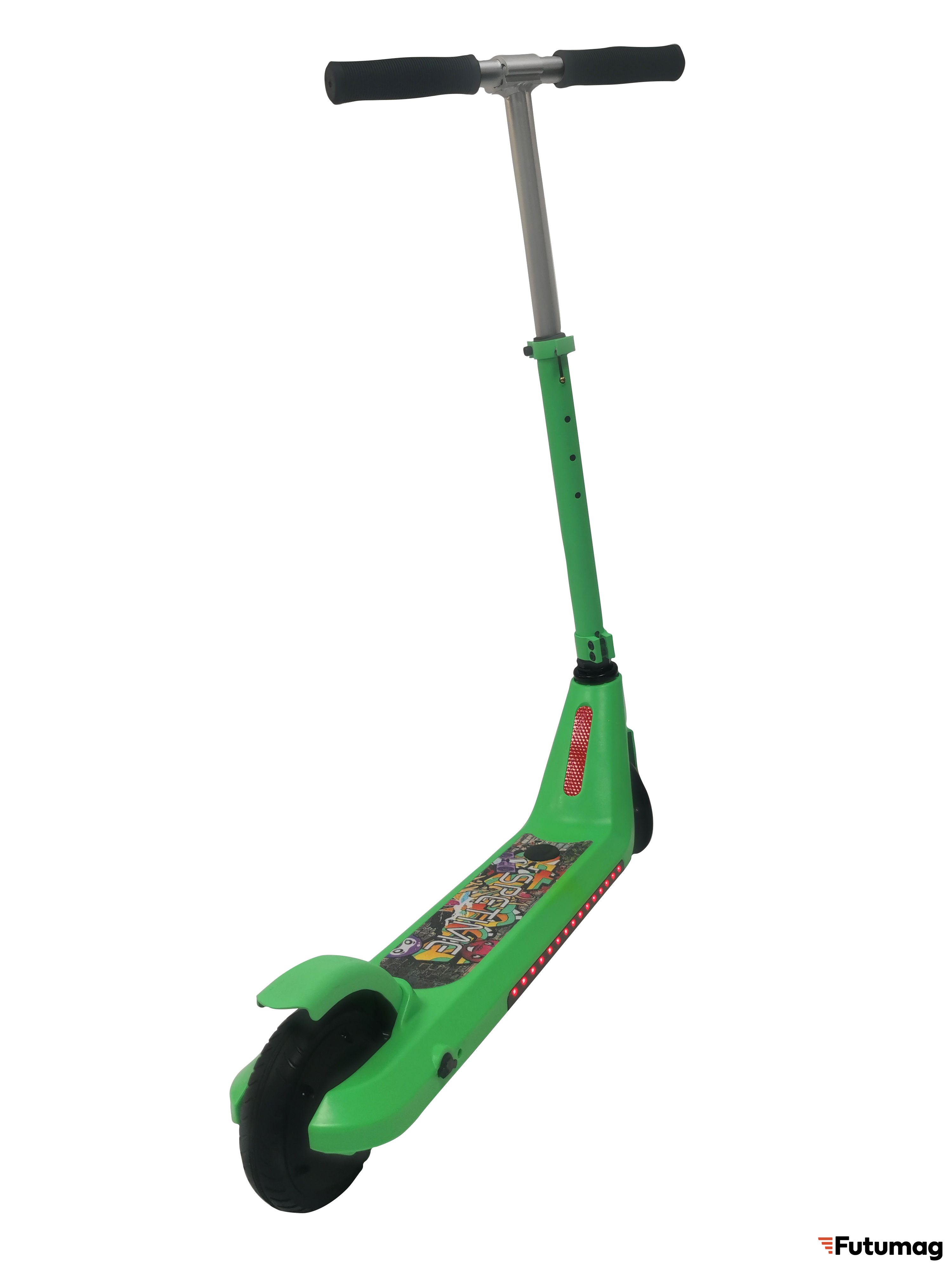 - Благодаря 100 Вт мотору самокат может разогнаться до 10 км/ч.