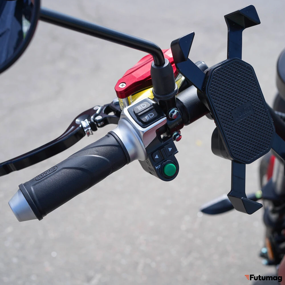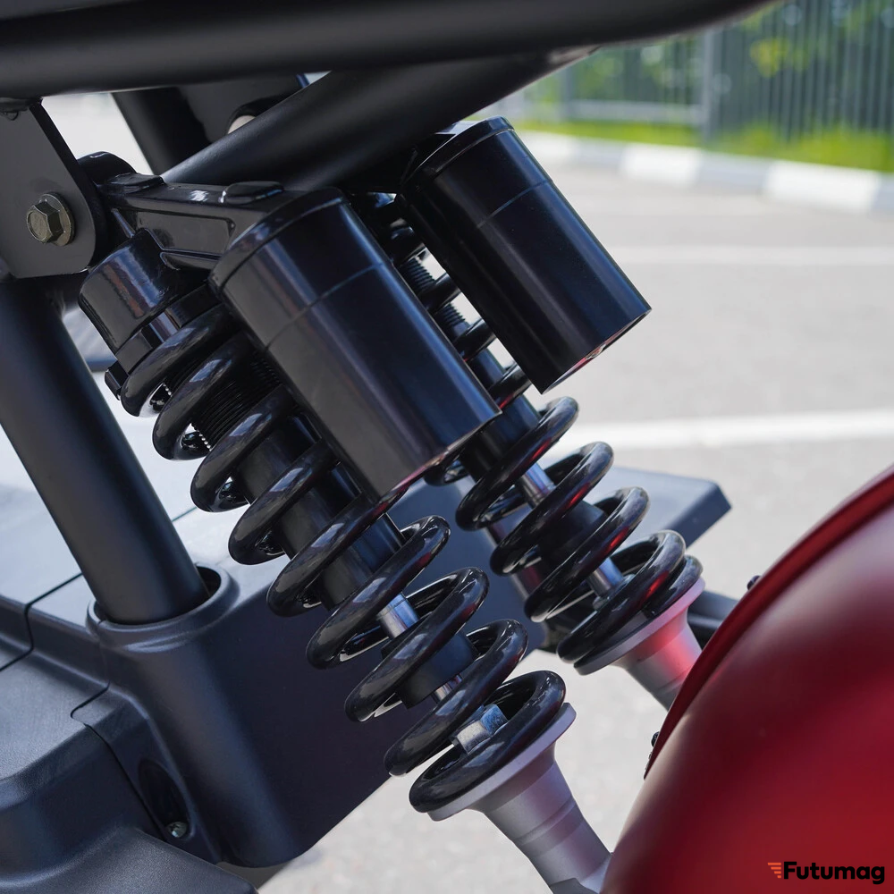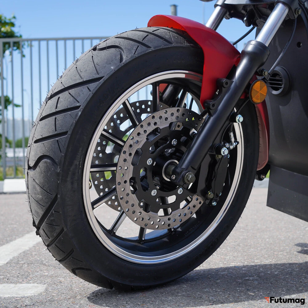 Основание для уверенной езды закладывает уникальная для электроскутеров колесная формула. Массивное заднее колесо нестандартного размера 215/40R13 и переднее 140/70R17 обеспечивают исключительное сцепление с дорогой, стабильность на высоких скоростях и плавное преодоление мелких неровностей. Такие колеса не только усиливают брутальный внешний вид, но и напрямую влияют на безопасность и комфорт. Парная амортизационная система (спереди — телескопическая вилка, сзади — два амортизатора) эффективно гасит вибрации и удары, делая поездку по городскому асфальту максимально комфортной.