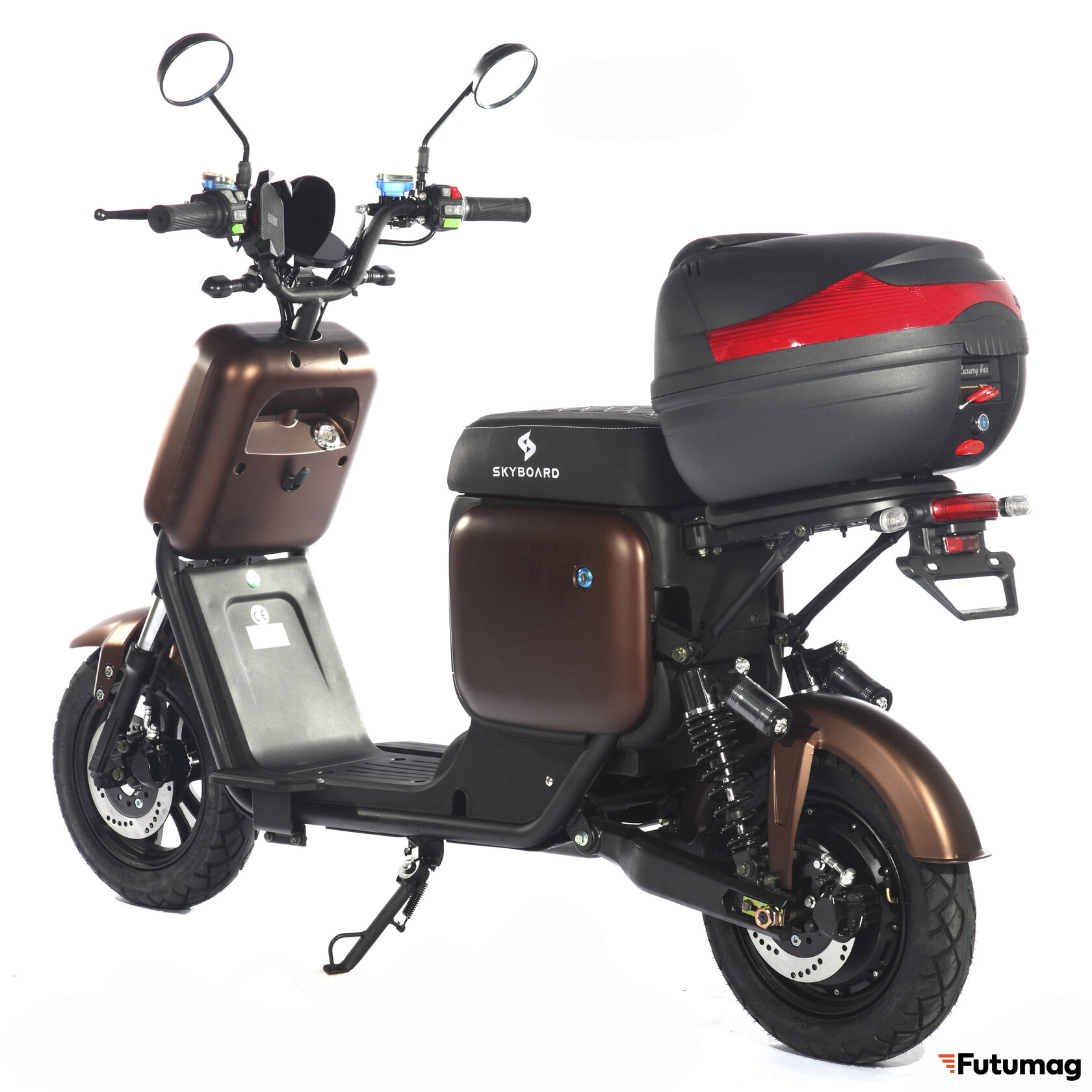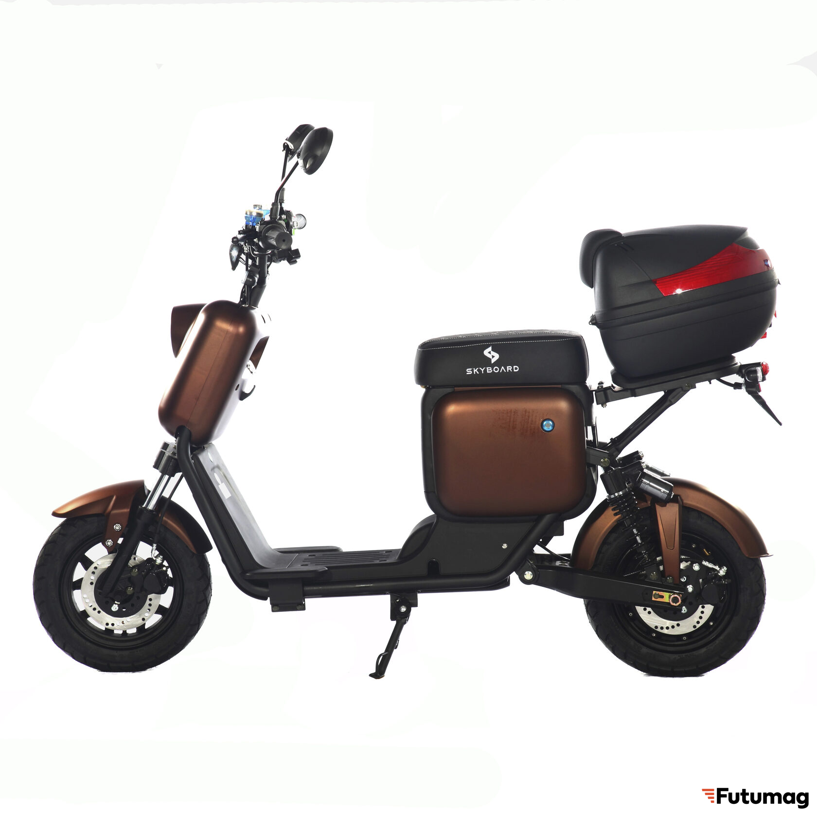 Skyboard Kazbek 1200W имеет двухместное сиденье, удобное для водителя и пассажира. Большой кофр со спинкой обеспечивает комфорт и дополнительное пространство для вещей, а крючок для сумки делает поездки еще более удобными.