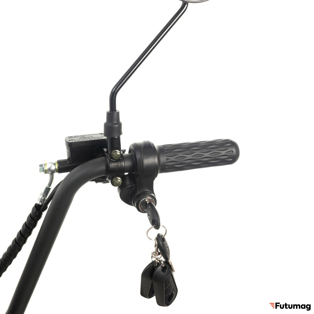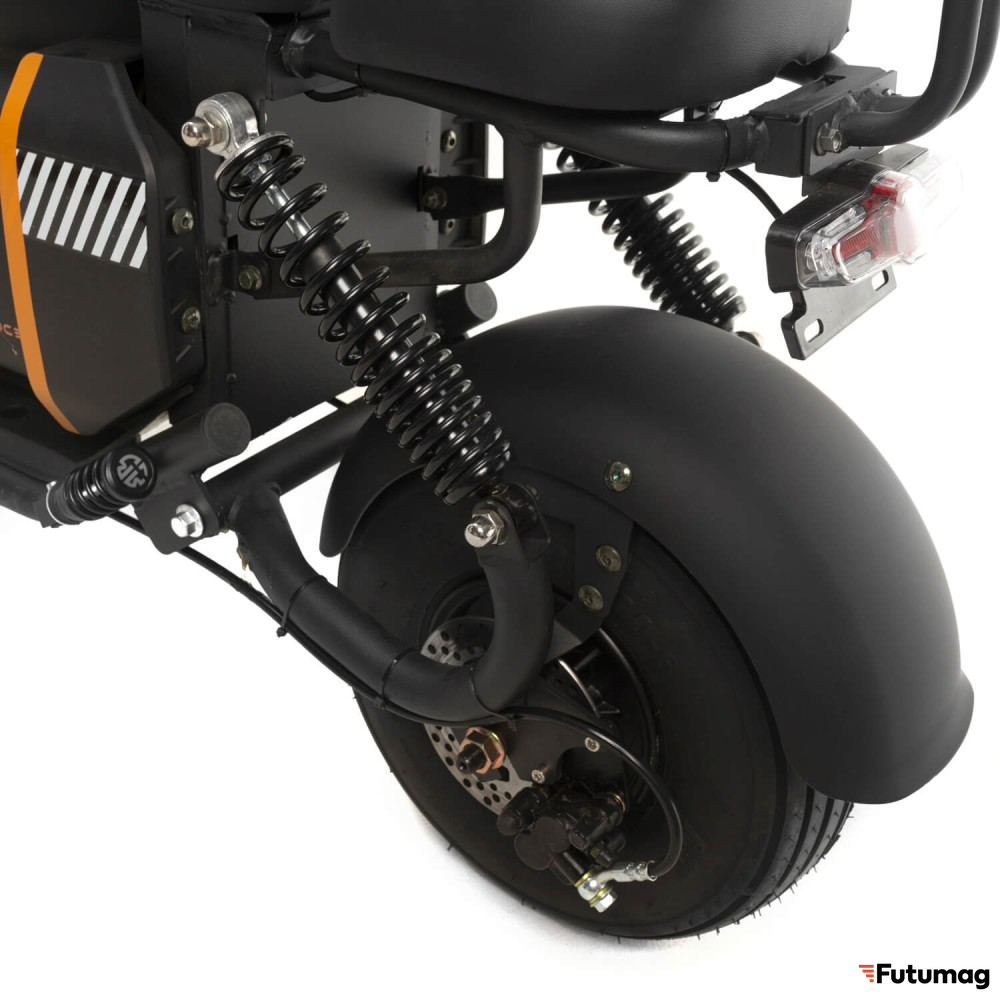 Электроскутер оснащен сиденьем и подножкой, что делает его удобным для длительных поездок и обеспечивает комфорт во время езды. Нескладная рама придает конструкции дополнительную прочность и надежность, что особенно важно для пользователей, которые планируют активное использование транспортного средства.
