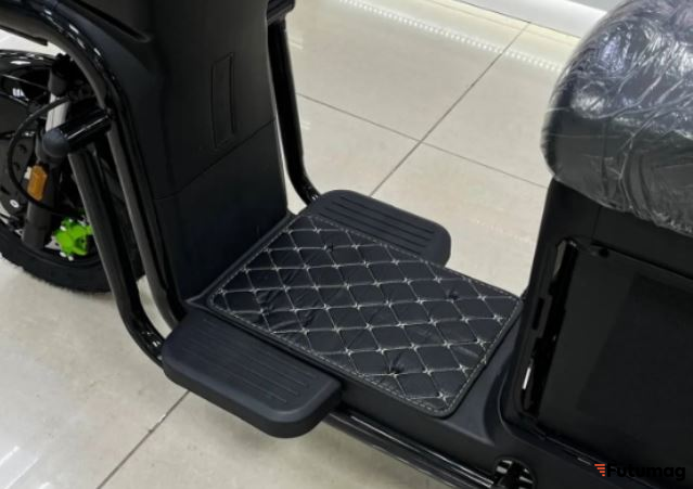Скутер имеет цельную раму, что обеспечивает дополнительную прочность и надежность конструкции. Он предназначен для взрослых и оснащён передней корзиной и задним багажником для удобства транспортировки вещей.