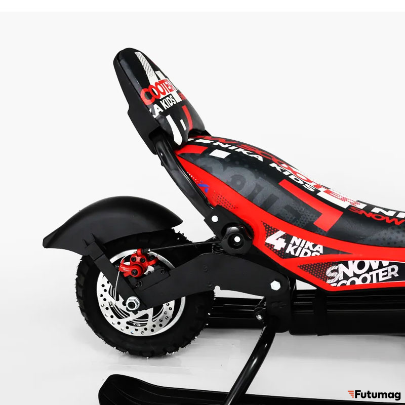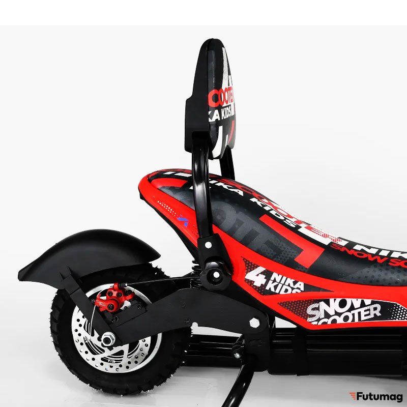 Рама из стали и корпус из пластика делают снегокат прочным и долговечным, способным выдерживать нагрузки и различные погодные условия. Давление в шинах составляет 2 атм, что обеспечивает хорошее сцепление с дорогой и уверенное движение по снегу.
