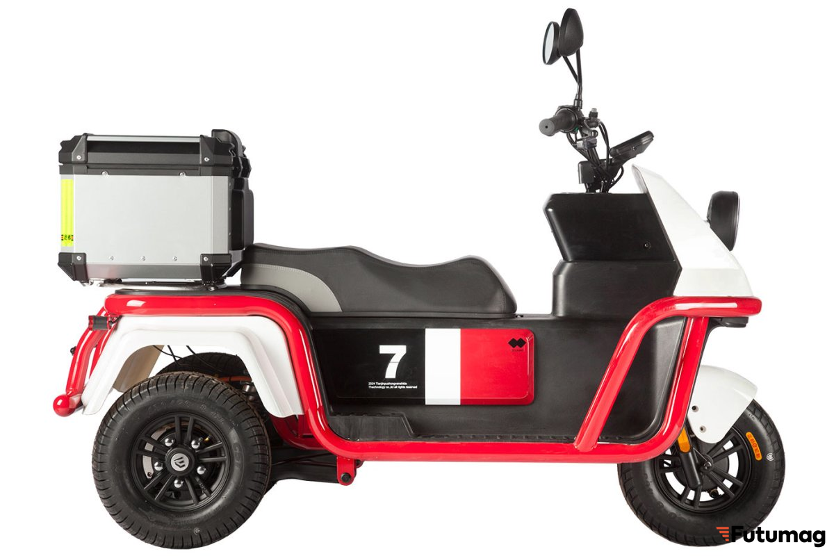 Эргономичное сиденье и продуманная конструкция обеспечивают комфорт для водителя и пассажира. Управление трициклом интуитивно понятно, что делает поездки приятными и безопасными.