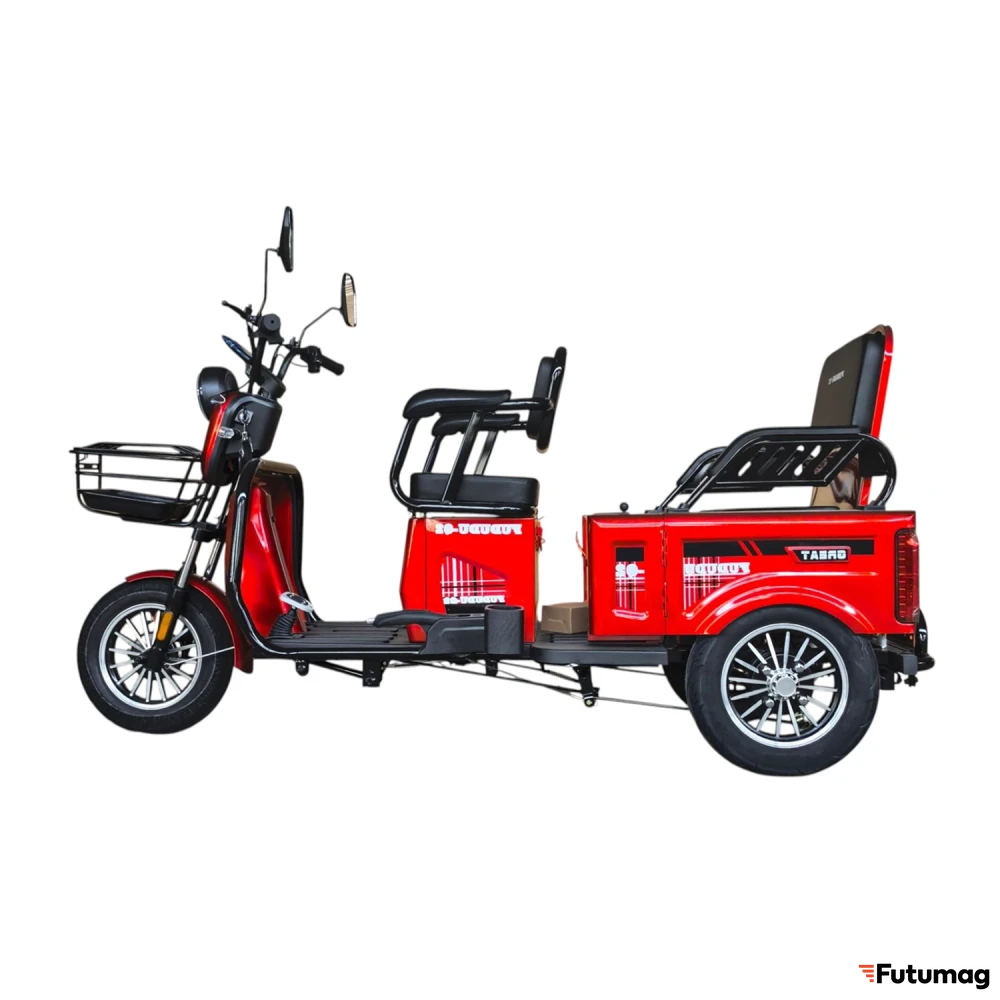 Электротрицикл оснащен мощным мотором на 1000 Вт, что позволяет развивать максимальную скорость до 35 км/ч. При этом пробег на одном заряде составляет до 45 км, что делает его идеальным вариантом для ежедневных поездок по городу.