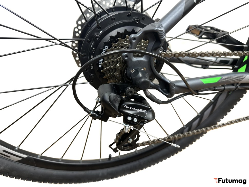 Система Prowheel с тремя звездами (42/34/24) и кассета Shimano TZ500-6 (14-28T) делают этот электровелосипед универсальным для любых маршрутов, будь то городские улицы или загородные дороги.