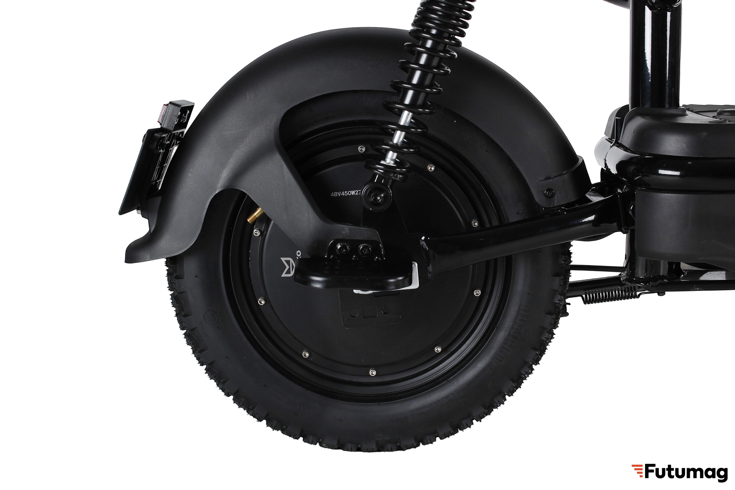 Передняя и задняя амортизация работают согласованно, эффективно гася удары от неровностей дорожного покрытия. Вес нетто составляет 46.5 кг, что обеспечивает устойчивость при движении и удобство транспортировки.
