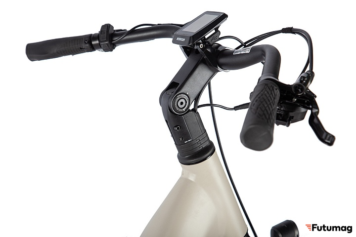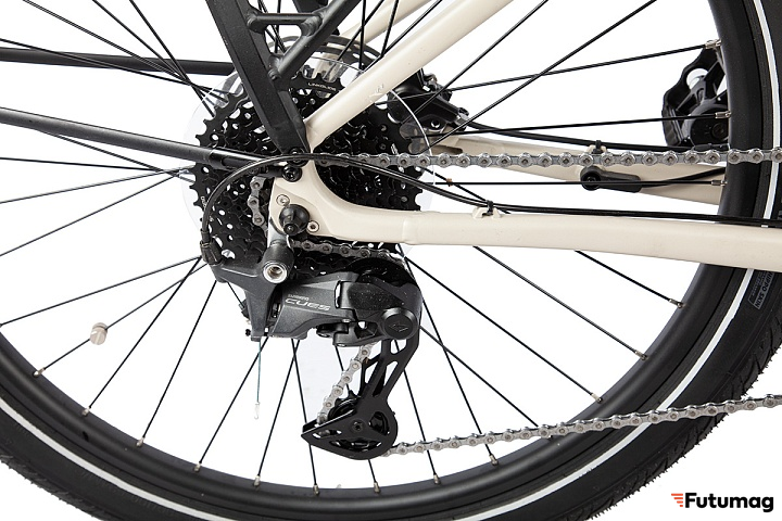 Электровелосипед оснащен центральным приводом и цепной передачей с 10 скоростями Shimano Cues, что позволяет легко адаптироваться к различным условиям дороги. Дисковые гидравлические тормоза диаметром 160 мм обеспечивают надежную остановку как спереди, так и сзади.