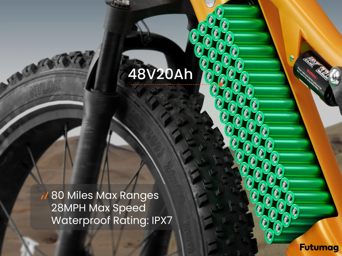 26-дюймовые колёса с широкими покрышками толщиной 4 дюйма созданы для настоящего бездорожья. Они уверенно идут по песку, снегу, грязи и гравию, не проваливаясь и не теряя сцепления. Агрессивный протектор обеспечивает надёжное сцепление с любыми поверхностями — от мокрого асфальта до рыхлого грунта. Большой диаметр колёс помогает легко перекатываться через ямы, корни и камни, делая поездку комфортной даже на самых сложных участках.