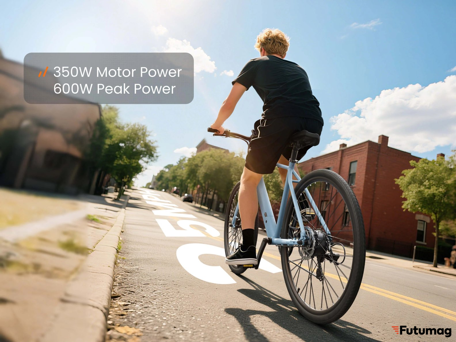 Электровелосипед оснащён двигателем мощностью 350 Вт, который обеспечивает плавный разгон и уверенное движение со скоростью до 40 км/ч. Этого достаточно для комфортного передвижения по городу, обгона медленного транспорта и своевременного прибытия в нужное место. Задний привод гарантирует хорошее сцепление с дорогой и устойчивость при старте с места, а также при движении по мокрому асфальту. Двигатель работает тихо и не создаёт лишнего шума, что особенно ценно при поездках ранним утром или поздним вечером.