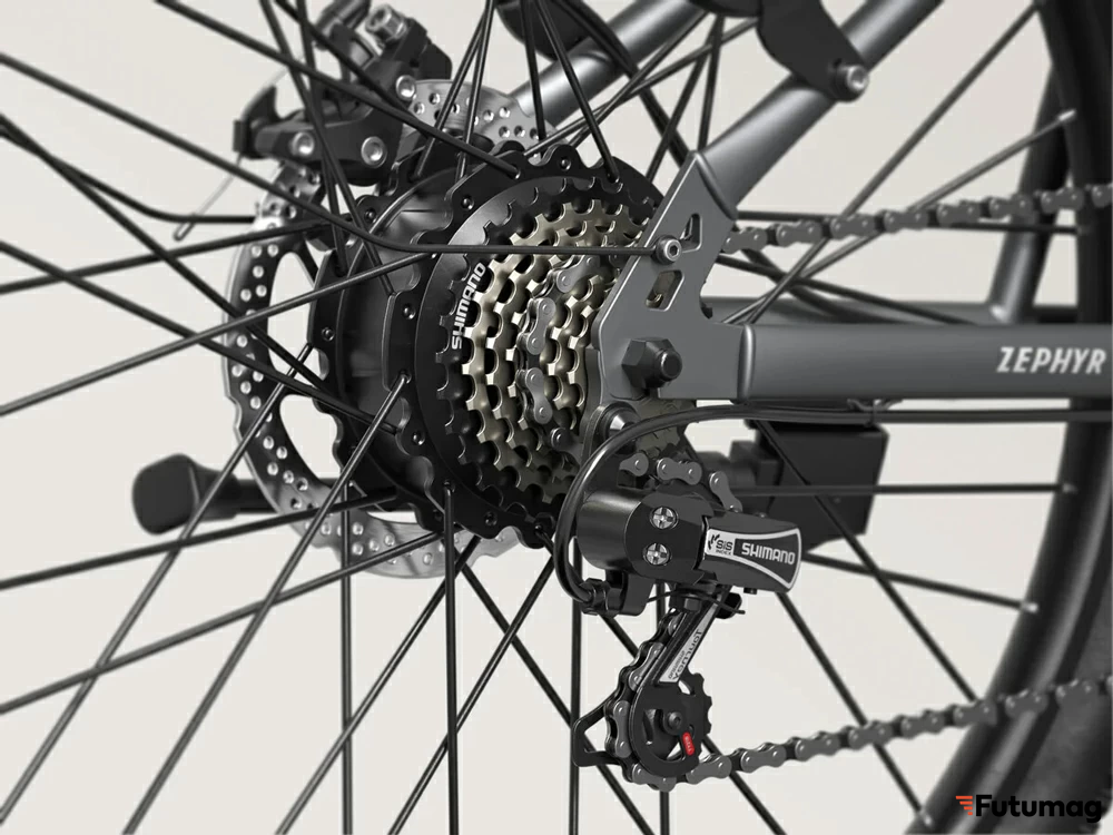 Велосипед оснащен 7-ступенчатой трансмиссией SHIMANO, позволяющей водителю выбирать оптимальную передачу в зависимости от условий движения. Механическая трансмиссия работает независимо от электропривода, что дает возможность использовать велосипед как обычный при разряженной батарее или для физической нагрузки. Переключение передач осуществляется манетками на руле, обеспечивая четкое и надежное переключение.