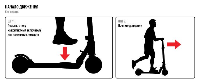 - Возьмитесь за рукоятку обеими руками и осторожно толкните самокат вперед. При включении самоката раздастся однократный звуковой сигнал.