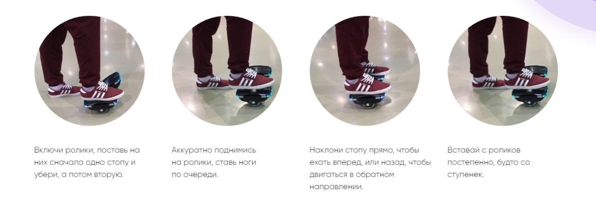 Тебе не придётся пробовать снова и снова. При включении гироролики сами примут горизонтальное положение. Тебе нужно лишь подняться на ролики и наклонить стопу вперед, чтобы начать движение.