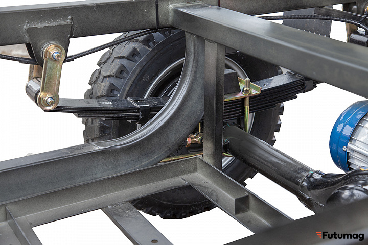 Подвеска включает гидравлические амортизаторы спереди и рессоры с 7 листами сзади, что гарантирует плавный ход и комфорт даже на неровных покрытиях. Барабанные тормоза на передних и задних колесах обеспечивают надежное торможение, что особенно важно при перевозке тяжелых грузов. Благодаря пониженной передаче, Rutrike Атлант-У способен уверенно справляться с подъемами и сложными маршрутами.