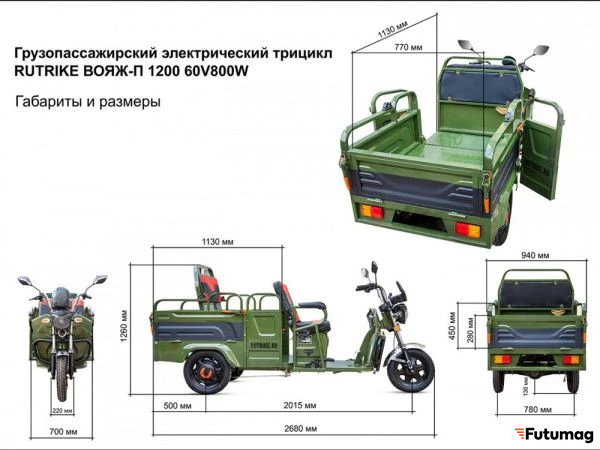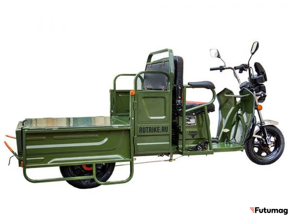 БрендRutrikeМощность800 WМаксимальная скорость25 км/чНапряжение60 VМаксимальная нагрузка400 кгВес131 кгВремя полной зарядки10 чКолеса12 ″ЦветЗеленыйМощная фараестьТормозная системаБарабанная (передний, задний)Дополнительное пассажирское местоестьПриводЗаднийТип аккумуляторных батарейSLA (Свинцово-кислотный)ДисплейестьМатериал рамыВысокоуглеродистая стальКоличество колес3Звуковой сигналестьЗеркала заднего видаЕстьПоворотникиесть -